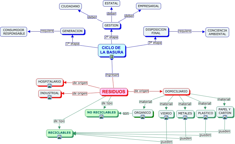 Este Cmap, tiene información relacionada con: CICLO DE LA BASURA, RESIDUOS de origen DOMICILIARIO, GESTION deber CIUDADANO, DOMICILIARIO material PLASTICO, DOMICILIARIO material ORGANICO, VIDRIO pueden RECICLABLES, CICLO DE LA BASURA 1º etapa GENERACION, GESTION deber EMPRESARIAL, ORGANICO son NO RECICLABLES, PAPEL Y CARTON pueden RECICLABLES, CICLO DE LA BASURA 2º etapa GESTION, RESIDUOS de origen INDUSTRIAL, PLASTICO pueden RECICLABLES, RESIDUOS ingresan CICLO DE LA BASURA, DOMICILIARIO material VIDRIO, GENERACION requiere CONSUMIDOR RESPONSABLE, RESIDUOS de tipo NO RECICLABLES, DOMICILIARIO material PAPEL Y CARTON, CICLO DE LA BASURA 3º etapa DISPOSICION FINAL, DOMICILIARIO material METALES, GESTION deber ESTATAL
