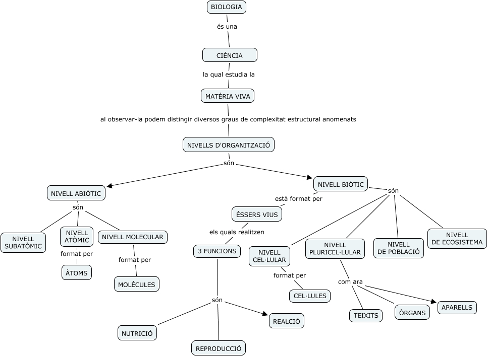 Este Cmap, tiene información relacionada con: NIVELLS D'ORGANITZACIÓ, NIVELL BIÒTIC està format per ÉSSERS VIUS, NIVELL PLURICEL·LULAR com ara TEIXITS, ÉSSERS VIUS els quals realitzen 3 FUNCIONS, NIVELLS D'ORGANITZACIÓ són NIVELL BIÒTIC, NIVELLS D'ORGANITZACIÓ són NIVELL ABIÒTIC, NIVELL PLURICEL·LULAR com ara APARELLS, NIVELL MOLECULAR format per MOLÉCULES, NIVELL BIÒTIC són NIVELL PLURICEL·LULAR, NIVELL ABIÒTIC són NIVELL MOLECULAR, NIVELL BIÒTIC són NIVELL DE ECOSISTEMA, CIÈNCIA la qual estudia la MATÈRIA VIVA, 3 FUNCIONS són REPRODUCCIÓ, NIVELL BIÒTIC són NIVELL CEL·LULAR, NIVELL PLURICEL·LULAR com ara ÒRGANS, NIVELL ABIÒTIC són NIVELL SUBATÒMIC, 3 FUNCIONS són REALCIÓ, MATÈRIA VIVA al observar-la podem distingir diversos graus de complexitat estructural anomenats NIVELLS D'ORGANITZACIÓ, NIVELL BIÒTIC són NIVELL DE POBLACIÓ, NIVELL ABIÒTIC són NIVELL ATÒMIC, NIVELL CEL·LULAR format per CEL·LULES