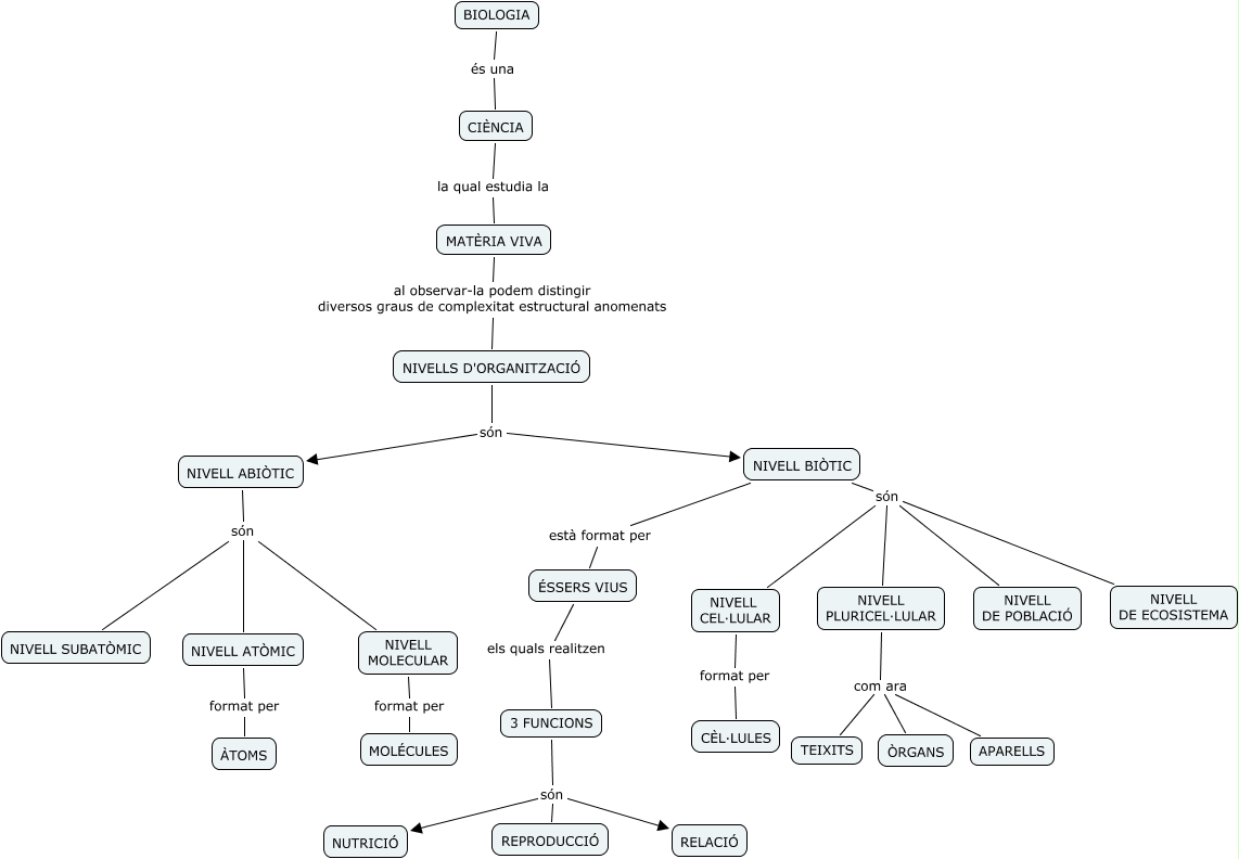 Este Cmap, tiene información relacionada con: Nivells d'organització, 3 FUNCIONS són RELACIÓ, NIVELLS D'ORGANITZACIÓ són NIVELL BIÒTIC, NIVELL BIÒTIC són NIVELL DE ECOSISTEMA, NIVELL PLURICEL·LULAR com ara TEIXITS, NIVELL BIÒTIC són NIVELL CEL·LULAR, NIVELL CEL·LULAR format per CÈL·LULES, NIVELL ABIÒTIC són NIVELL MOLECULAR, CIÈNCIA la qual estudia la MATÈRIA VIVA, MATÈRIA VIVA al observar-la podem distingir diversos graus de complexitat estructural anomenats NIVELLS D'ORGANITZACIÓ, NIVELL ATÒMIC format per ÀTOMS, NIVELL PLURICEL·LULAR com ara ÒRGANS, NIVELL PLURICEL·LULAR com ara APARELLS, NIVELL ABIÒTIC són NIVELL SUBATÒMIC, NIVELL BIÒTIC són NIVELL DE POBLACIÓ, NIVELLS D'ORGANITZACIÓ són NIVELL ABIÒTIC, 3 FUNCIONS són REPRODUCCIÓ, NIVELL BIÒTIC són NIVELL PLURICEL·LULAR, BIOLOGIA és una CIÈNCIA, ÉSSERS VIUS els quals realitzen 3 FUNCIONS, 3 FUNCIONS són NUTRICIÓ