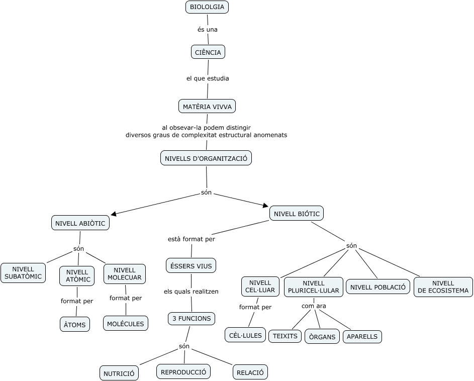 Este Cmap, tiene información relacionada con: NIVELLS D'ORGANITZACIÓ, MATÈRIA VIVVA al obsevar-la podem distingir diversos graus de complexitat estructural anomenats NIVELLS D'ORGANITZACIÓ, NIVELL BIÓTIC està format per ÉSSERS VIUS, 3 FUNCIONS són NUTRICIÓ, NIVELL ATÒMIC format per ÀTOMS, NIVELL MOLECUAR format per MOLÉCULES, NIVELL ABIÒTIC són NIVELL MOLECUAR, 3 FUNCIONS són REPRODUCCIÓ, NIVELL PLURICEL·LULAR com ara TEIXITS, NIVELLS D'ORGANITZACIÓ són NIVELL ABIÒTIC, NIVELL PLURICEL·LULAR com ara APARELLS, CIÊNCIA el que estudia MATÈRIA VIVVA, NIVELL PLURICEL·LULAR com ara ÒRGANS, NIVELL ABIÒTIC són NIVELL SUBATÒMIC, NIVELL BIÓTIC són NIVELL DE ECOSISTEMA, NIVELL BIÓTIC són NIVELL POBLACIÓ, NIVELL BIÓTIC són NIVELL PLURICEL·LULAR, NIVELL CEL·LUAR format per CÈL·LULES, 3 FUNCIONS són RELACIÓ, NIVELLS D'ORGANITZACIÓ són NIVELL BIÓTIC, NIVELL ABIÒTIC són NIVELL ATÒMIC