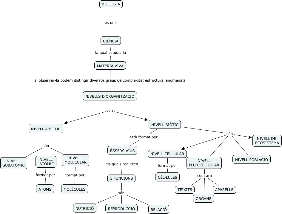 Este Cmap, tiene información relacionada con: nivells d'organització, 3 FUNCIONS són NUTRICIÓ, NIVELL ATÒMIC format per ÀTOMS, MATÈRIA VIVA al observar-la podem distingir diversos graus de complexitat estructural anomenats NIVELLS D'ORGANITZACIÓ, NIVELL PLURICEL·LULAR com ara TEIXITS, ÉSSERS VIUS els quals realitzen 3 FUNCIONS, NIVELL BIÒTIC són NIVELL PLURICEL·LULAR, NIVELL BIÒTIC són NIVELL DE ECOSISTEMA, 3 FUNCIONS són RELACIÓ, NIVELLS D'ORGANITZACIÓ són NIVELL ABIÒTIC, NIVELL BIÒTIC són NIVELL POBLACIÓ, CIÈNCIA la qual estudia la MATÈRIA VIVA, NIVELL ABIÒTIC són NIVELL MOLECULAR, NIVELL BIÒTIC són NIVELL CEL·LULAR, NIVELL PLURICEL·LULAR com ara APARELLS, NIVELL PLURICEL·LULAR com ara ÒRGANS, NIVELL BIÒTIC està format per ÉSSERS VIUS, NIVELL ABIÒTIC són NIVELL ATÒMIC, 3 FUNCIONS són REPRODUCCIÓ, NIVELLS D'ORGANITZACIÓ són NIVELL BIÒTIC, NIVELL ABIÒTIC són NIVELL SUBATÒMIC