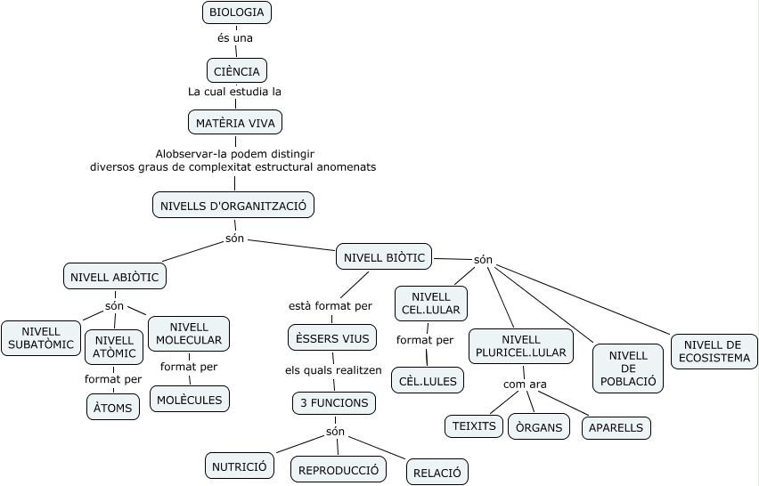 Este Cmap, tiene información relacionada con: Nivells d'Organització, NIVELL ABIÒTIC són NIVELL ATÒMIC, NIVELL MOLECULAR són NIVELL SUBATÒMIC, NIVELL ATÒMIC format per ÀTOMS, NIVELLS D'ORGANITZACIÓ són NIVELL ABIÒTIC, 3 FUNCIONS són REPRODUCCIÓ, NIVELL PLURICEL.LULAR com ara ÒRGANS, NIVELL MOLECULAR format per MOLÈCULES, NIVELL BIÒTIC està format per ÈSSERS VIUS, NIVELL PLURICEL.LULAR com ara TEIXITS, CIÈNCIA La cual estudia la MATÈRIA VIVA, NIVELL BIÒTIC són NIVELL DE ECOSISTEMA, NIVELL BIÒTIC són NIVELL DE POBLACIÓ, NIVELL CEL.LULAR format per CÈL.LULES, NIVELL MOLECULAR són NIVELL ATÒMIC, 3 FUNCIONS són NUTRICIÓ, MATÈRIA VIVA Alobservar-la podem distingir diversos graus de complexitat estructural anomenats NIVELLS D'ORGANITZACIÓ, NIVELLS D'ORGANITZACIÓ són NIVELL BIÒTIC, NIVELL BIÒTIC són NIVELL CEL.LULAR, ÈSSERS VIUS els quals realitzen 3 FUNCIONS, CIÈNCIA és una BIOLOGIA