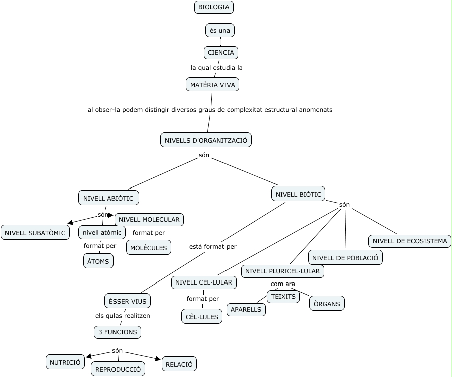 Este Cmap, tiene información relacionada con: NIVELLS DE ORGAnització ) DANI CASAS, nivell atòmic format per ÀTOMS, NIVELL BIÒTIC són NIVELL DE POBLACIÓ, 3 FUNCIONS són RELACIÓ, ÉSSER VIUS els qulas realitzen 3 FUNCIONS, MATÈRIA VIVA al obser-la podem distingir diversos graus de complexitat estructural anomenats NIVELLS D'ORGANITZACIÓ, NIVELLS D'ORGANITZACIÓ són NIVELL ABIÒTIC, NIVELL BIÒTIC són NIVELL CEL·LULAR, 3 FUNCIONS són NUTRICIÓ, NIVELL ABIÒTIC són NIVELL SUBATÒMIC, NIVELL ABIÒTIC són nivell atòmic, 3 FUNCIONS són REPRODUCCIÓ, NIVELL BIÒTIC són NIVELL PLURICEL·LULAR, NIVELL ABIÒTIC són NIVELL MOLECULAR, NIVELLS D'ORGANITZACIÓ són NIVELL BIÒTIC, NIVELL PLURICEL·LULAR com ara TEIXITS, NIVELL CEL·LULAR format per CÈL·LULES, NIVELL PLURICEL·LULAR com ara ÒRGANS, és una CIENCIA, CIENCIA la qual estudia la MATÈRIA VIVA, NIVELL BIÒTIC està format per ÉSSER VIUS