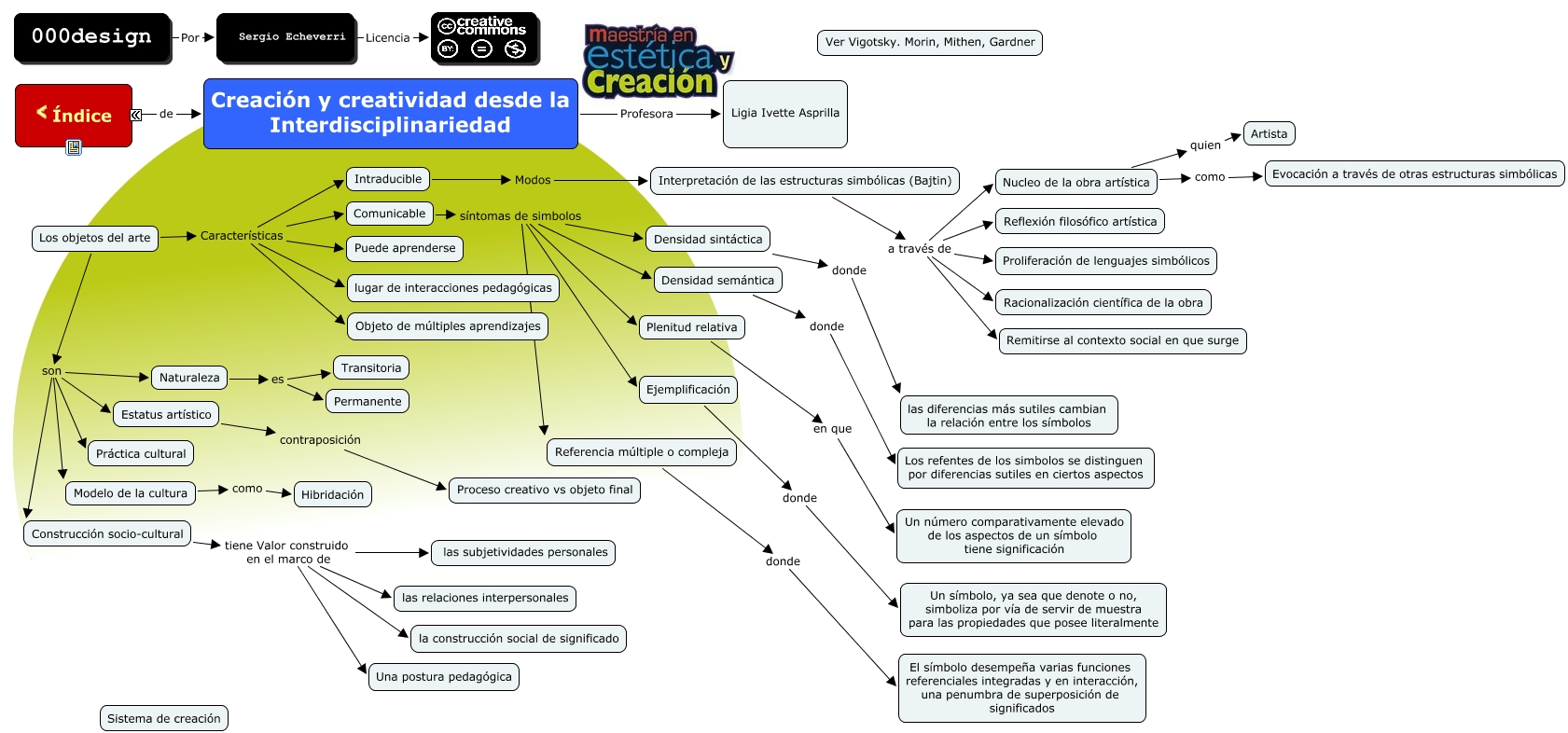 Este Cmap, tiene información relacionada con: Creación y creatividad desde la interdisciplinariedad, Los objetos del arte Características Objeto de múltiples aprendizajes, Comunicable síntomas de simbolos Referencia múltiple o compleja, Interpretación de las estructuras simbólicas (Bajtin) a través de Remitirse al contexto social en que surge, Creación y creatividad desde la Interdisciplinariedad Profesora Ligia Ivette Asprilla, Densidad semántica donde Los refentes de los simbolos se distinguen por diferencias sutiles en ciertos aspectos, Interpretación de las estructuras simbólicas (Bajtin) a través de Racionalización científica de la obra, Comunicable síntomas de simbolos Densidad semántica, Construcción socio-cultural tiene Valor construido en el marco de Una postura pedagógica, ???? de Creación y creatividad desde la Interdisciplinariedad, Construcción socio-cultural tiene Valor construido en el marco de las subjetividades personales, Construcción socio-cultural tiene Valor construido en el marco de la construcción social de significado, Los objetos del arte Características Intraducible, Nucleo de la obra artística como Evocación a través de otras estructuras simbólicas, 000design Por Sergio Echeverri, Los objetos del arte son Naturaleza, Construcción socio-cultural tiene Valor construido en el marco de las relaciones interpersonales, Densidad sintáctica donde las diferencias más sutiles cambian la relación entre los símbolos, Comunicable síntomas de simbolos Plenitud relativa, Los objetos del arte Características Comunicable, Modelo de la cultura como Hibridación