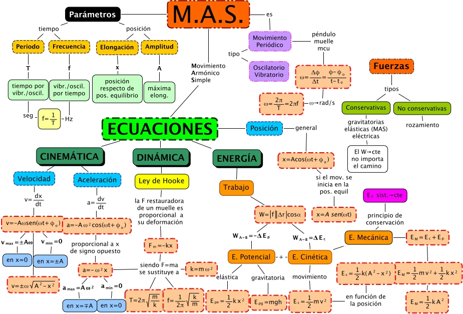 Este Cmap, tiene información relacionada con: MAS Pedro Barber Lloréns, Movimiento Periódico tipo Oscilatorio Vibratorio, <math xmlns="http://www.w3.org/1998/Math/MathML"> <mtext> Posición </mtext> </math> general <math xmlns="http://www.w3.org/1998/Math/MathML"> <mrow> <mtext> x=Acos(ωt+ </mtext> <mmultiscripts> <mtext> φ </mtext> <mtext> o </mtext> <none/> </mmultiscripts> <mtext> ) </mtext> </mrow> </math>, tiempo por vibr./oscil. seg <math xmlns="http://www.w3.org/1998/Math/MathML"> <mrow> <mtext> f= </mtext> <mfrac> <mtext> 1 </mtext> <mtext> T </mtext> </mfrac> </mrow> </math>, ENERGÍA Trabajo, <math xmlns="http://www.w3.org/1998/Math/MathML"> <mrow> <mmultiscripts> <mtext> F </mtext> <mtext> m </mtext> <none/> </mmultiscripts> <mtext> =-kx </mtext> </mrow> </math> siendo F=ma se sustituye a <math xmlns="http://www.w3.org/1998/Math/MathML"> <mrow> <mtext> k=m </mtext> <mmultiscripts> <mtext> ω </mtext> <none/> <mtext> 2 </mtext> </mmultiscripts> </mrow> </math>, CINEMÁTICA Aceleración, M.A.S. es Movimiento Periódico, E. Potencial + E. Cinética, Trabajo <math xmlns="http://www.w3.org/1998/Math/MathML"> <mrow> <mtext> W= </mtext> <mfenced open="|" close="|"> <mtext> f </mtext> </mfenced> <mfenced open="|" close="|"> <mtext> Δr </mtext> </mfenced> <mtext> cosα </mtext> </mrow> </math>, <math xmlns="http://www.w3.org/1998/Math/MathML"> <mrow> <mtext> a=- </mtext> <mmultiscripts> <mtext> ω </mtext> <none/> <mtext> 2 </mtext> </mmultiscripts> <mtext> x </mtext> </mrow> </math> <math xmlns="http://www.w3.org/1998/Math/MathML"> <mrow> <mmultiscripts> <mtext> a </mtext> <mtext> max </mtext> <none/> </mmultiscripts> <mtext> =A </mtext> <mmultiscripts> <mtext> ω </mtext> <none/> <mtext> 2 </mtext> </mmultiscripts> </mrow> </math> en x=∓A, CINEMÁTICA Velocidad, M.A.S. Parámetros, Conservativas gravitatorias elásticas (MAS) eléctricas El W→cte no importa el camino, <math xmlns="http://www.w3.org/1998/Math/MathML"> <mrow> <mtext> a=- </mtext> <mmultiscripts> <mtext> ω </mtext> <none/> <mtext> 2 </mtext> </mmultiscripts> <mtext> x </mtext> </mrow> </math> <math xmlns="http://www.w3.org/1998/Math/MathML"> <mrow> <mmultiscripts> <mtext> a </mtext> <mtext> min </mtext> <none/> </mmultiscripts> <mtext> =0 </mtext> </mrow> </math> en x=0, <math xmlns="http://www.w3.org/1998/Math/MathML"> <mrow> <mtext> ω= </mtext> <mfrac> <mtext> Δφ </mtext> <mtext> Δt </mtext> </mfrac> <mtext> = </mtext> <mfrac> <mrow> <mtext> φ- </mtext> <mmultiscripts> <mtext> φ </mtext> <mtext> o </mtext> <none/> </mmultiscripts> </mrow> <mrow> <mtext> t- </mtext> <mmultiscripts> <mtext> t </mtext> <mtext> o </mtext> <none/> </mmultiscripts> </mrow> </mfrac> </mrow> </math> ω→rad/s <math xmlns="http://www.w3.org/1998/Math/MathML"> <mrow> <mtext> ω= </mtext> <mfrac> <mtext> 2π </mtext> <mtext> T </mtext> </mfrac> <mtext> =2πf </mtext> </mrow> </math>, <math xmlns="http://www.w3.org/1998/Math/MathML"> <mrow> <mtext> x=Acos(ωt+ </mtext> <mmultiscripts> <mtext> φ </mtext> <mtext> o </mtext> <none/> </mmultiscripts> <mtext> ) </mtext> </mrow> </math> si el mov. se inicia en la pos. equil x=A sen(ωt), <math xmlns="http://www.w3.org/1998/Math/MathML"> <mrow> <mtext> W= </mtext> <mfenced open="|" close="|"> <mtext> f </mtext> </mfenced> <mfenced open="|" close="|"> <mtext> Δr </mtext> </mfenced> <mtext> cosα </mtext> </mrow> </math> <math xmlns="http://www.w3.org/1998/Math/MathML"> <mrow> <mmultiscripts> <mtext> W </mtext> <mtext> A→B </mtext> <none/> </mmultiscripts> <mtext> =Δ </mtext> <mmultiscripts> <mtext> E </mtext> <mtext> c </mtext> <none/> </mmultiscripts> </mrow> </math> E. Cinética, Frecuencia f vibr./oscil. por tiempo, <math xmlns="http://www.w3.org/1998/Math/MathML"> <mrow> <mtext> v=-Aωsen(ωt+ </mtext> <mmultiscripts> <mtext> φ </mtext> <mtext> o </mtext> <none/> </mmultiscripts> <mtext> ) </mtext> </mrow> </math> <math xmlns="http://www.w3.org/1998/Math/MathML"> <mrow> <mmultiscripts> <mtext> v </mtext> <mtext> max </mtext> <none/> </mmultiscripts> <mtext> =±Aω </mtext> </mrow> </math> en x=0, No conservativas rozamiento El W→cte no importa el camino
