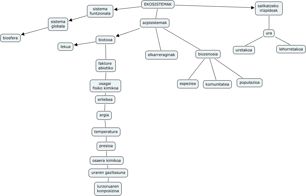 IHMC CmapTools-ekin sortu den kontzeptu-mapa honek honi buruzko informazioa du: ekosistemak, EKOSISTEMAK sailkatzeko irizpideak, sailkatzeko irizpideak ura, biozenosia espeziea, azpisistemak elkarreraginak, biozenosia populazioa, uraren gazitasuna lurzoruaren konposizioa, argia temperatura, sistema globala biosfera, osaera kimikoa uraren gazitasuna, azpisistemak biotooa, azpisistemak biozenosia, presioa osaera kimikoa, EKOSISTEMAK azpisistemak, erliebea argia, sistema funtzionala sistema globala, biozenosia komunitatea, osagai fisiko kimikoa erliebea, ura lehorretakoa, faktore abiotiko osagai fisiko kimikoa, EKOSISTEMAK sistema funtzionala