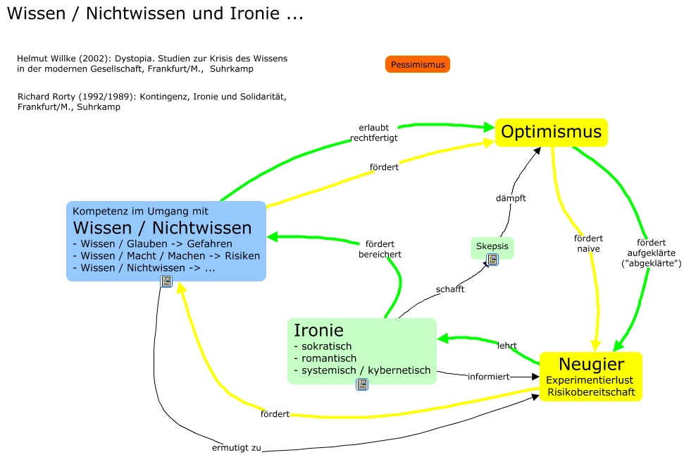 Dieses mit IHMC CmapTools erstellte CMap hat Informationen bezüglich: Wissen-Nichtwissen, Skepsis dämpft Optimismus, Neugier Experimentierlust Risikobereitschaft fördert Kompetenz im Umgang mit Wissen / Nichtwissen - Wissen / Glauben -> Gefahren - Wissen / Macht / Machen -> Risiken - Wissen / Nichtwissen -> ..., Ironie - sokratisch - romantisch - systemisch / kybernetisch schafft Skepsis, Neugier Experimentierlust Risikobereitschaft lehrt Ironie - sokratisch - romantisch - systemisch / kybernetisch, Optimismus fördert aufgeklärte ("abgeklärte") Neugier Experimentierlust Risikobereitschaft, Optimismus fördert naive Neugier Experimentierlust Risikobereitschaft, Kompetenz im Umgang mit Wissen / Nichtwissen - Wissen / Glauben -> Gefahren - Wissen / Macht / Machen -> Risiken - Wissen / Nichtwissen -> ... erlaubt rechtfertigt Optimismus, Kompetenz im Umgang mit Wissen / Nichtwissen - Wissen / Glauben -> Gefahren - Wissen / Macht / Machen -> Risiken - Wissen / Nichtwissen -> ... fördert Optimismus, Ironie - sokratisch - romantisch - systemisch / kybernetisch fördert bereichert Kompetenz im Umgang mit Wissen / Nichtwissen - Wissen / Glauben -> Gefahren - Wissen / Macht / Machen -> Risiken - Wissen / Nichtwissen -> ..., Kompetenz im Umgang mit Wissen / Nichtwissen - Wissen / Glauben -> Gefahren - Wissen / Macht / Machen -> Risiken - Wissen / Nichtwissen -> ... ermutigt zu Neugier Experimentierlust Risikobereitschaft