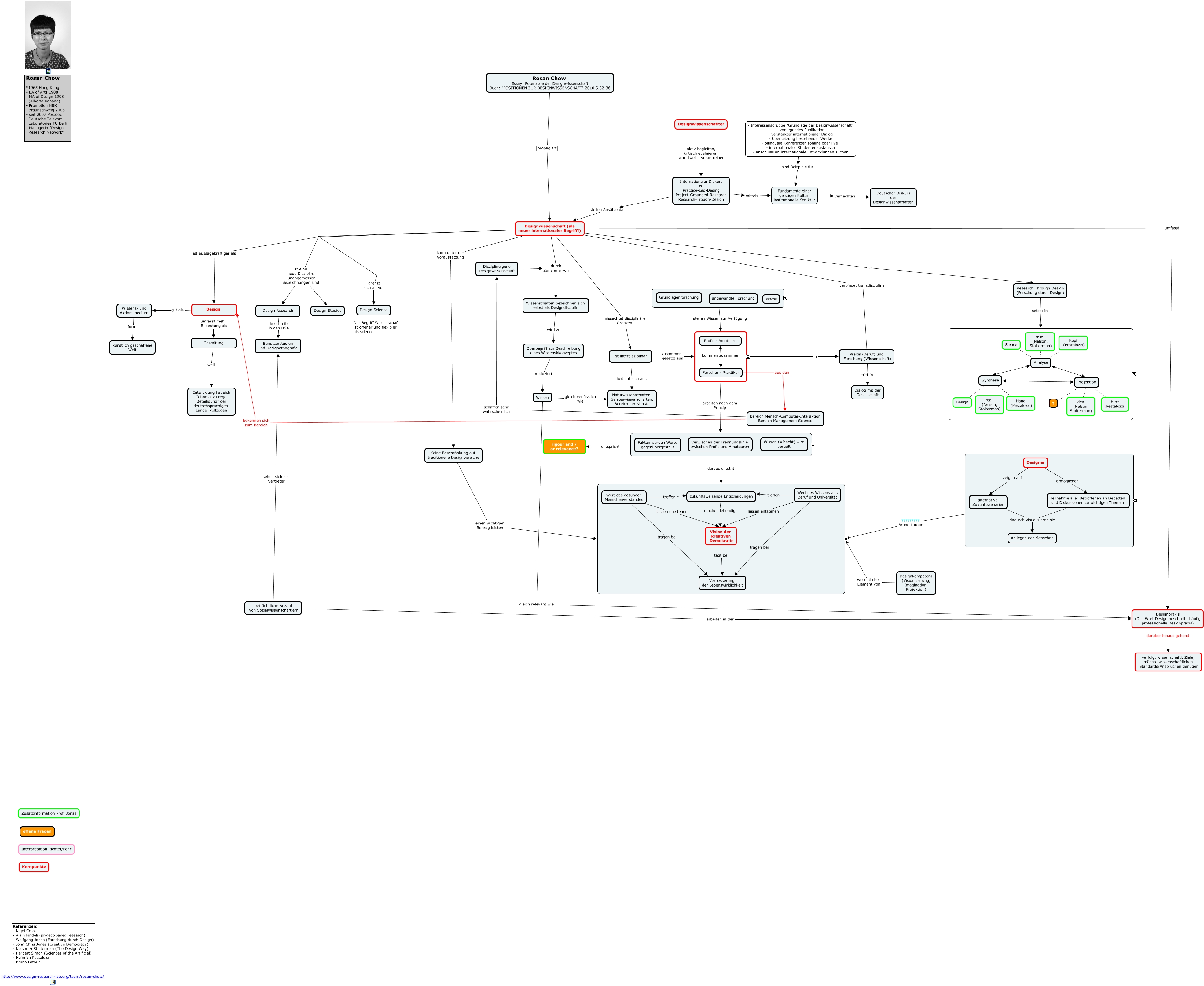 Dieses mit IHMC CmapTools erstellte CMap hat Informationen bezüglich: Text Rosan Chow Vers_4, Kopf (Pestalozzi) Analyse, Wert des gesunden Menschenverstandes lassen entstehen Vision der kreativen Demokratie, Wissens- und Aktionsmedium formt künstlich geschaffene Welt, ???? ????????? Bruno Latour ????, beträchtliche Anzahl von Sozialwissenschaftlern arbeiten in der Designpraxis (Das Wort Design beschreibt häufig professionelle Designpraxis), Wissen gleich relevant wie Designpraxis (Das Wort Design beschreibt häufig professionelle Designpraxis), idea (Nelson, Stolterman) Projektion, Herz (Pestalozzi) Projektion, Designwissenschaflter aktiv begleiten, kritisch evaluieren, schrittweise vorantreiben Internationaler Diskurs zu Practice-Led-Desing Project-Grounded-Research Research-Trough-Design, ???? daraus entstht ????, Rosan Chow Essay: Potenziale der Designwissenschaft Buch: "POSITIONEN ZUR DESIGNWISSENSCHAFT" 2010 S.32-36 propagiert Designwissenschaft (als neuer internationaler Begriff!), Internationaler Diskurs zu Practice-Led-Desing Project-Grounded-Research Research-Trough-Design stellen Ansätze dar Designwissenschaft (als neuer internationaler Begriff!), Bereich Mensch-Computer-Interaktion Bereich Management Science bekennen sich zum Bereich Design, ???? arbeiten nach dem Prinzip ????, Designwissenschaft (als neuer internationaler Begriff!) ist Research Through Design (Forschung durch Design), Designwissenschaft (als neuer internationaler Begriff!) verbindet transdisziplinär Praxis (Beruf) und Forschung (Wissenschaft), - Interessensgruppe "Grundlage der Designwissenschaft" - vorliegendes Publikation - verstärkter internationaler Dialog - Übersetzung bestehender Werke - bilinguale Konferenzen (online oder live) - internationaler Studentenaustausch - Anschluss an internationale Entwicklungen suchen sind Beispiele für Fundamente einer geistigen Kultur, institutionelle Struktur, Designer ermöglichen Teilnahme aller Betroffenen an Debatten und Diskussionen zu wichtigen Themen, Designer zeigen auf alternative Zukunftszenarien, Internationaler Diskurs zu Practice-Led-Desing Project-Grounded-Research Research-Trough-Design mittels Fundamente einer geistigen Kultur, institutionelle Struktur