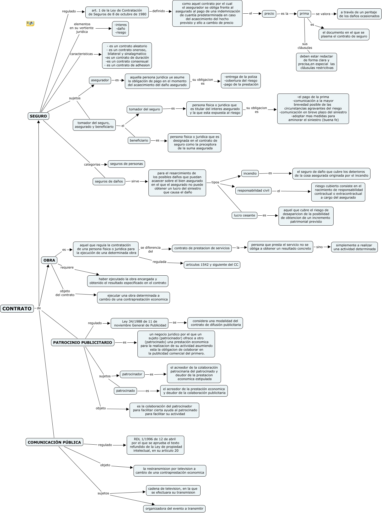 Aquest mapa conceptual conté informació relacionada amb: Mapa conceptual 1, responsabilidad civil el riesgo cubierto consiste en el nacimiento de responsabilidad contractual o extracontractual a cargo del asegurado, patrocinado es el acreedor de la prestación economica y deudor de la colaboración publicitaria, contrato de prestacion de servicios la persona que presta el servicio no se obliga a obtener un resultado concreto, precio es la prima, COMUNICACIÓN PÚBLICA objeto la restransmision por television a cambio de una contraprestación economica, PATROCINIO PUBLICITARIO es un negocio juridico por el que un sujeto (patrocinador) ofrece a otro (patrocinado) una prestación economica para la realizacion de su actividad asumiendo esta la obligacion de colaborar en la publicidad comercial del primero., SEGURO categorias seguros de daños, aquel que regula la contratación de una persona fisica o juridica para la ejecución de una determinada obra regulada articulos 1542 y siguiente del CC, beneficiario es persona fisica o juridica que es designada en el contrato de seguro como la preceptora de la suma asegurada, COMUNICACIÓN PÚBLICA regulado RDL 1/1996 de 12 de abril por el que se aprueba el texto refundido de la Ley de propiedad intelectual, en su articulo 20, CONTRATO de PATROCINIO PUBLICITARIO, prima sus cláusulas deben estar redactar de forma clara y precisa,en especial las cláusulas restricitvas, PATROCINIO PUBLICITARIO sujetos patrocinador, Ley 34/1988 de 11 de noviembre General de Publicidad se considera una modalidad del contrato de difusión publicitaria, SEGURO categorias seguros de personas, lucro cesante es aquel que cubre el riesgo de desaparicion de la posibilidad de obtencion de un incremento patrimonial previsto, OBRA objeto del contrato ejecutar una obra determinada a cambio de una contraprestación economica, tomador del seguro es persona fisica o juridica que es titular del interes asegurado y la que esta expuesta al riesgo, persona fisica o juridica que es titular del interes asegurado y la que esta expuesta al riesgo su obligacion es -el pago de la prima -comunicación a la mayor brevedad posible de las circunstancias agravantes del riesgo -comunicación en breve plazo del siniestro -adoptar mas medidas para aminorar el siniestro (buena fe), patrocinador es el acreedor de la colaboración patrocinaria del patrocinado y deudor de la prestacion economica estipulada