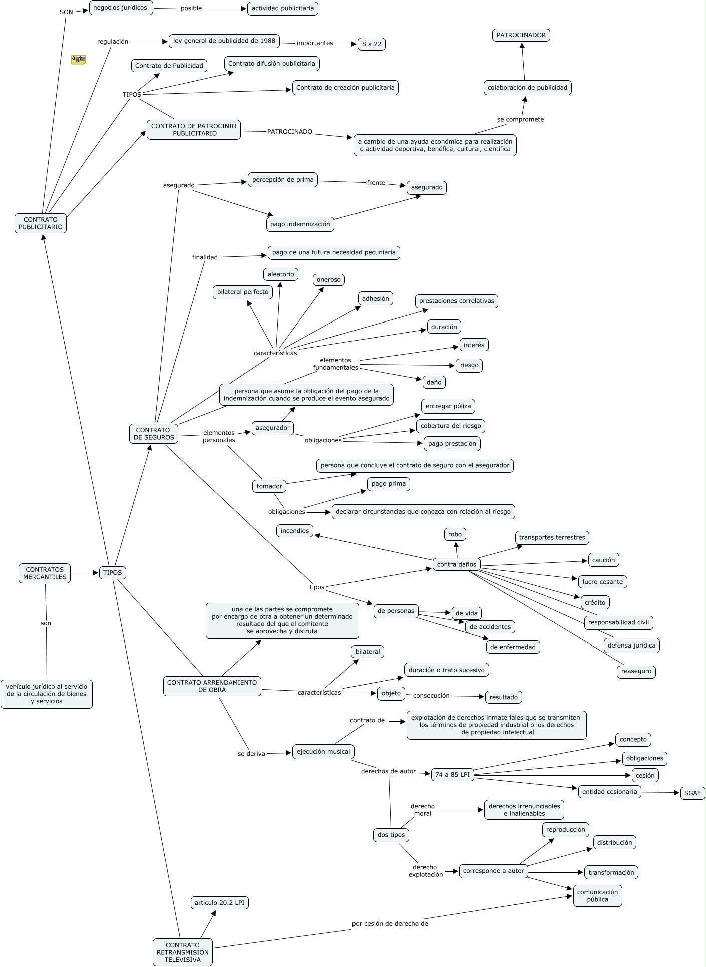 Aquest mapa conceptual conté informació relacionada amb: MERCA 3 ESCENARIO 1, CONTRATO DE SEGUROS asegurado pago indemnización, CONTRATO PUBLICITARIO TIPOS CONTRATO DE PATROCINIO PUBLICITARIO, CONTRATO DE SEGUROS asegurado percepción de prima, CONTRATO ARRENDAMIENTO DE OBRA características objeto, CONTRATO DE SEGUROS tipos de personas, tomador ???? persona que concluye el contrato de seguro con el asegurador, corresponde a autor ???? comunicación pública, CONTRATO DE PATROCINIO PUBLICITARIO PATROCINADO a cambio de una ayuda económica para realización d actividad deportiva, benéfica, cultural, científica, 74 a 85 LPI ???? concepto, ejecución musical contrato de explotación de derechos inmateriales que se transmiten los términos de propiedad industrial o los derechos de propiedad intelectual, asegurador obligaciones entregar póliza, colaboración de publicidad ???? PATROCINADOR, CONTRATOS MERCANTILES ???? TIPOS, CONTRATO ARRENDAMIENTO DE OBRA características duración o trato sucesivo, CONTRATO PUBLICITARIO TIPOS Contrato de creación publicitaria, CONTRATO PUBLICITARIO TIPOS Contrato difusión publicitaria, de personas ???? de accidentes, CONTRATO DE SEGUROS elementos personales asegurador, CONTRATO DE SEGUROS elementos fundamentales interés, corresponde a autor ???? reproducción