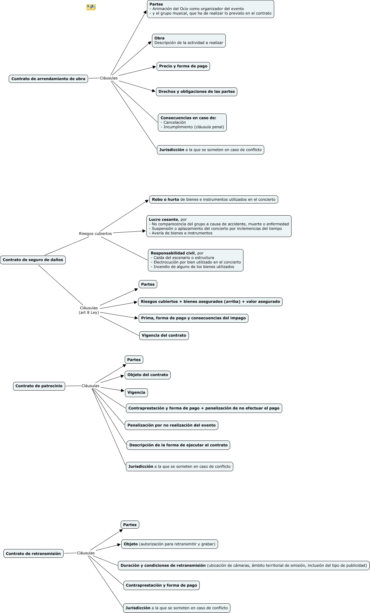 Este Cmap, tiene información relacionada con: Caso 1 (concierto), Contrato de seguro de daños Cláusulas (art 8 Ley) Vigencia del contrato, Contrato de retransmisión Cláusulas Duración y condiciones de retransmisión (ubicación de cámaras, ámbito territorial de emisión, inclusión del tipo de publicidad), Contrato de arrendamiento de obra Cláusulas Consecuencias en caso de: - Cancelación - Incumplimiento (cláusula penal), Contrato de patrocinio Cláusulas Penalización por no realización del evento, Contrato de retransmisión Cláusulas Contraprestación y forma de pago, Contrato de seguro de daños Cláusulas (art 8 Ley) Partes, Contrato de retransmisión Cláusulas Jurisdicción a la que se someten en caso de conflicto, Contrato de arrendamiento de obra Cláusulas Jurisdicción a la que se someten en caso de conflicto, Contrato de arrendamiento de obra Cláusulas Obra Descripción de la actividad a realizar, Contrato de retransmisión Cláusulas Objeto (autorización para retransmitir y grabar), Contrato de patrocinio Cláusulas Objeto del contrato, Contrato de arrendamiento de obra Cláusulas Precio y forma de pago, Contrato de patrocinio Cláusulas Vigencia, Contrato de seguro de daños Cláusulas (art 8 Ley) Prima, forma de pago y consecuencias del impago, Contrato de patrocinio Cláusulas Jurisdicción a la que se someten en caso de conflicto, Contrato de seguro de daños Cláusulas (art 8 Ley) Riesgos cubiertos + bienes asegurados (arriba) + valor asegurado, Contrato de seguro de daños Riesgos cubiertos Responsabilidad civil, por - Caída del escenario o estructura - Electrocución por bien utilizado en el concierto - Incendio de alguno de los bienes utilizados, Contrato de patrocinio Cláusulas Descripción de la forma de ejecutar el contrato, Contrato de seguro de daños Riesgos cubiertos Lucro cesante, por - No comparecencia del grupo a causa de accidente, muerte o enfermedad - Suspensión o aplazamiento del concierto por inclemencias del tiempo - Avería de bienes e instrumentos, Contrato de seguro de daños Riesgos cubiertos Robo o hurto de bienes e instrumentos utilizados en el concierto