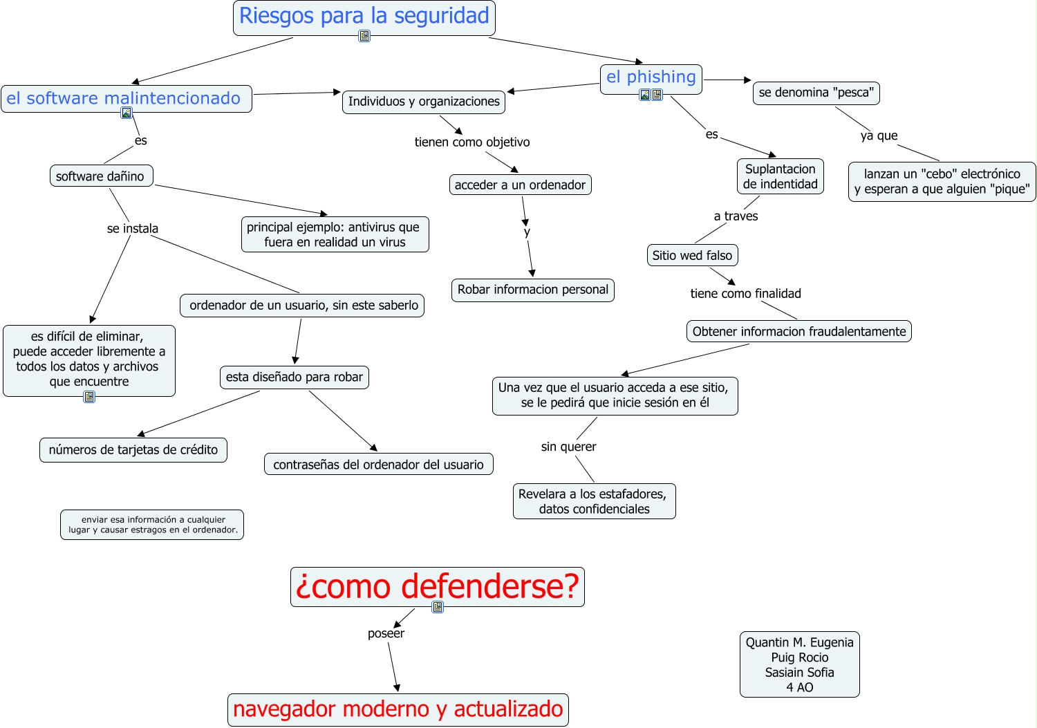 Este Cmap, tiene información relacionada con: QUANTIN PAGINA 13, esta diseñado para robar números de tarjetas de crédito, se denomina "pesca" ya que lanzan un "cebo" electrónico y esperan a que alguien "pique", software dañino principal ejemplo: antivirus que fuera en realidad un virus, Riesgos para la seguridad el phishing, software dañino se instala ordenador de un usuario, sin este saberlo, ¿como defenderse? poseer navegador moderno y actualizado, el phishing es Suplantacion de indentidad, Sitio wed falso tiene como finalidad Obtener informacion fraudalentamente, acceder a un ordenador y Robar informacion personal, el software malintencionado Individuos y organizaciones, ordenador de un usuario, sin este saberlo esta diseñado para robar, esta diseñado para robar contraseñas del ordenador del usuario, el phishing Individuos y organizaciones, Obtener informacion fraudalentamente Una vez que el usuario acceda a ese sitio, se le pedirá que inicie sesión en él, el phishing se denomina "pesca", Individuos y organizaciones tienen como objetivo acceder a un ordenador, el software malintencionado es software dañino, Riesgos para la seguridad el software malintencionado, software dañino se instala es difícil de eliminar, puede acceder libremente a todos los datos y archivos que encuentre, Suplantacion de indentidad a traves Sitio wed falso