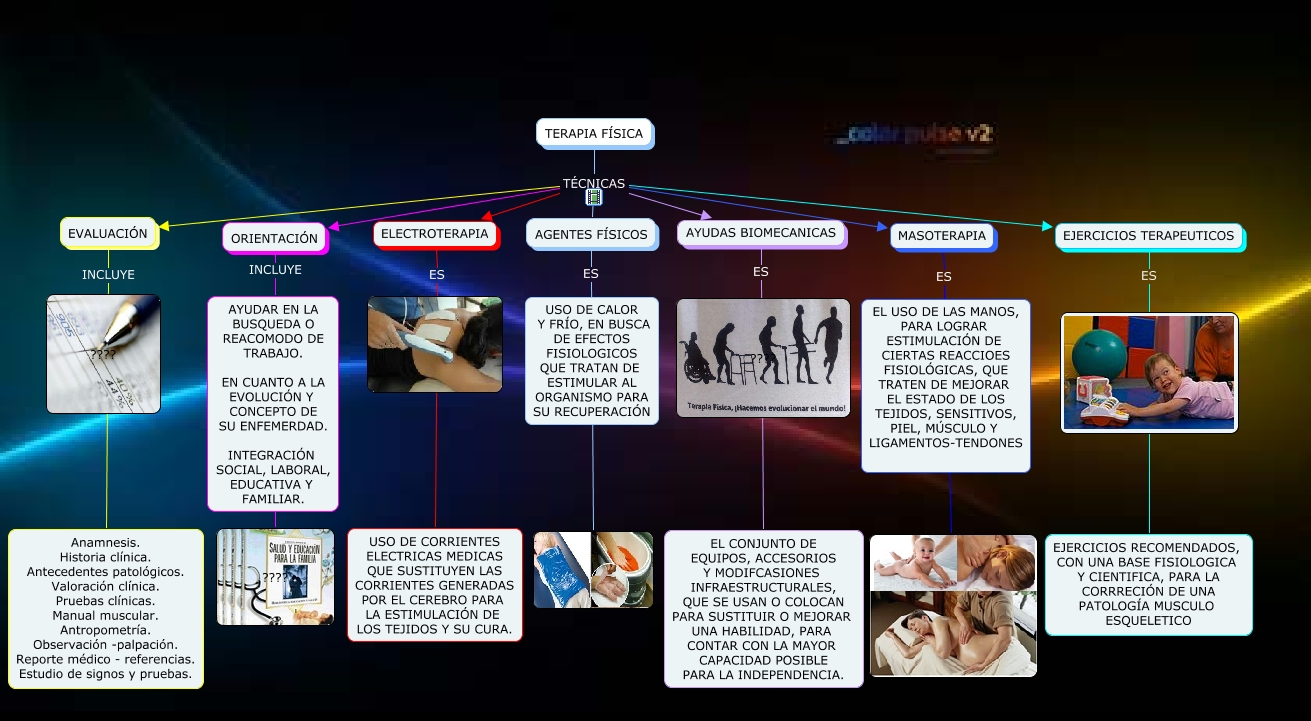Este Cmap, tiene información relacionada con: TÉCNICAS DE TF, AYUDAR EN LA BUSQUEDA O REACOMODO DE TRABAJO. EN CUANTO A LA EVOLUCIÓN Y CONCEPTO DE SU ENFEMERDAD. INTEGRACIÓN SOCIAL, LABORAL, EDUCATIVA Y FAMILIAR. ???? ????, EJERCICIOS TERAPEUTICOS ES EJERCICIOS RECOMENDADOS, CON UNA BASE FISIOLOGICA Y CIENTIFICA, PARA LA CORRRECIÓN DE UNA PATOLOGÍA MUSCULO ESQUELETICO, MASOTERAPIA ES EL USO DE LAS MANOS, PARA LOGRAR ESTIMULACIÓN DE CIERTAS REACCIOES FISIOLÓGICAS, QUE TRATEN DE MEJORAR EL ESTADO DE LOS TEJIDOS, SENSITIVOS, PIEL, MÚSCULO Y LIGAMENTOS-TENDONES, TERAPIA FÍSICA TÉCNICAS MASOTERAPIA, ELECTROTERAPIA ES USO DE CORRIENTES ELECTRICAS MEDICAS QUE SUSTITUYEN LAS CORRIENTES GENERADAS POR EL CEREBRO PARA LA ESTIMULACIÓN DE LOS TEJIDOS Y SU CURA., TERAPIA FÍSICA TÉCNICAS AYUDAS BIOMECANICAS, EVALUACIÓN INCLUYE Anamnesis. Historia clínica. Antecedentes patológicos. Valoración clínica. Pruebas clínicas. Manual muscular. Antropometría. Observación -palpación. Reporte médico - referencias. Estudio de signos y pruebas., MASOTERAPIA ES, AGENTES FÍSICOS ES, TERAPIA FÍSICA TÉCNICAS EVALUACIÓN, TERAPIA FÍSICA TÉCNICAS ORIENTACIÓN, TERAPIA FÍSICA TÉCNICAS ELECTROTERAPIA, TERAPIA FÍSICA TÉCNICAS EJERCICIOS TERAPEUTICOS, TERAPIA FÍSICA TÉCNICAS AGENTES FÍSICOS, ORIENTACIÓN INCLUYE AYUDAR EN LA BUSQUEDA O REACOMODO DE TRABAJO. EN CUANTO A LA EVOLUCIÓN Y CONCEPTO DE SU ENFEMERDAD. INTEGRACIÓN SOCIAL, LABORAL, EDUCATIVA Y FAMILIAR., AYUDAS BIOMECANICAS ES EL CONJUNTO DE EQUIPOS, ACCESORIOS Y MODIFCASIONES INFRAESTRUCTURALES, QUE SE USAN O COLOCAN PARA SUSTITUIR O MEJORAR UNA HABILIDAD, PARA CONTAR CON LA MAYOR CAPACIDAD POSIBLE PARA LA INDEPENDENCIA.