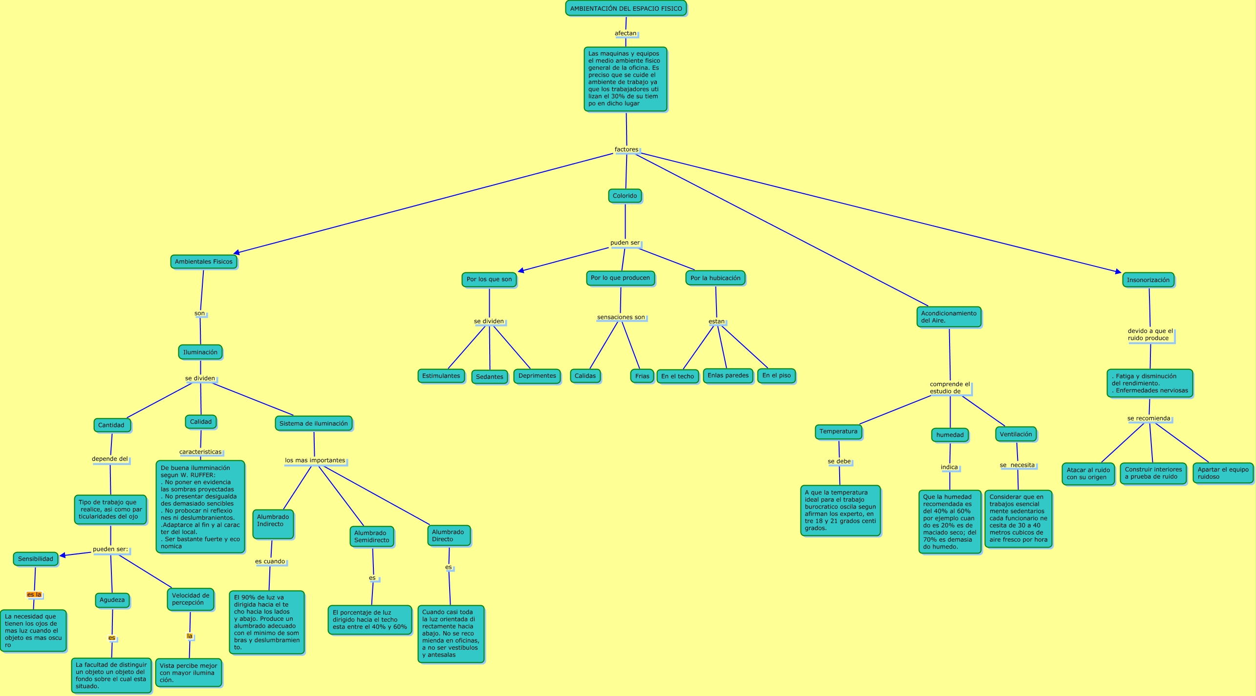 Este Cmap, tiene información relacionada con: AMBIENTACION DE SERVICIOS, AMBIENTACIÓN DEL ESPACIO FISICO afectan Las maquinas y equipos el medio ambiente fisico general de la oficina. Es preciso que se cuide el ambiente de trabajo ya que los trabajadores uti lizan el 30% de su tiem po en dicho lugar, Tipo de trabajo que realice, asi como par ticularidades del ojo pueden ser: Sensibilidad, Por la hubicación estan Enlas paredes, Por los que son se dividen Deprimentes, Las maquinas y equipos el medio ambiente fisico general de la oficina. Es preciso que se cuide el ambiente de trabajo ya que los trabajadores uti lizan el 30% de su tiem po en dicho lugar factores Acondicionamiento del Aire., humedad indica Que la humedad recomendada es del 40% al 60% por ejemplo cuan do es 20% es de maciado seco; del 70% es demasia do humedo., Las maquinas y equipos el medio ambiente fisico general de la oficina. Es preciso que se cuide el ambiente de trabajo ya que los trabajadores uti lizan el 30% de su tiem po en dicho lugar factores Colorido, Acondicionamiento del Aire. comprende el estudio de Ventilación, Acondicionamiento del Aire. comprende el estudio de humedad, Por los que son se dividen Sedantes, Por los que son se dividen Estimulantes, Alumbrado Semidirecto es El porcentaje de luz dirigido hacia el techo esta entre el 40% y 60%, Iluminación se dividen Sistema de iluminación, Velocidad de percepción la Vista percibe mejor con mayor ilumina ción., Colorido puden ser Por la hubicación, Por lo que producen sensaciones son Frias, Iluminación se dividen Cantidad, Temperatura se debe A que la temperatura ideal para el trabajo burocratico oscila segun afirman los experto, en tre 18 y 21 grados centi grados., Cantidad depende del Tipo de trabajo que realice, asi como par ticularidades del ojo, . Fatiga y disminución del rendimiento. . Enfermedades nerviosas se recomienda Atacar al ruido con su origen
