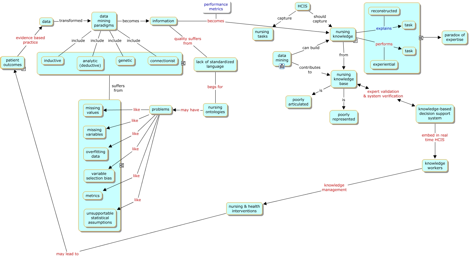 This Concept Map, created with IHMC CmapTools, has information related to: data mining, nursing knowledge base is poorly represented, patient outcomes evidence based practice data, experiential performs task, problems like metrics, data mining can build nursing knowledge, nursing knowledge performs task, performance metrics becomes nursing knowledge, HCIS should capture nursing knowledge, problems like unsupportable statistical assumptions, ???? ???? paradox of expertise, knowledge-based decision support system embed in real time HCIS knowledge workers, lack of standardized language begs for nursing ontologies, information becomes nursing knowledge, data mining paradigms include inductive, HCIS capture nursing tasks, reconstructed explains task, information quality suffers from lack of standardized language, data mining paradigms include analytic (deductive), data mining paradigms include genetic, knowledge-based decision support system expert validation & system verification nursing knowledge base