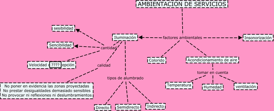 Este Cmap, tiene información relacionada con: AMBIENTACION DE SERVICIOS, AMBIENTACION DE SERVICIOS factores ambientales Insonorización, AMBIENTACION DE SERVICIOS factores ambientales Iluminación, Iluminación cantidad sesibilidad, Iluminación tipos de alumbrado Directo, Acondicionamiento de aire tomar en cuenta Humedad, Iluminación cantidad Velocidad de percepción, Iluminación calidad No poner en evidencia las zonas proyectadas No prestar desigualdades demasiado sensibles No provocar ni reflexiones ni deslumbramientos, Iluminación cantidad Sencibilidad, Iluminación tipos de alumbrado Semidirecto, AMBIENTACION DE SERVICIOS factores ambientales Acondicionamiento de aire, Acondicionamiento de aire tomar en cuenta Temperatura, Acondicionamiento de aire tomar en cuenta ventilación, Iluminación tipos de alumbrado Indirecto, AMBIENTACION DE SERVICIOS factores ambientales Colorido