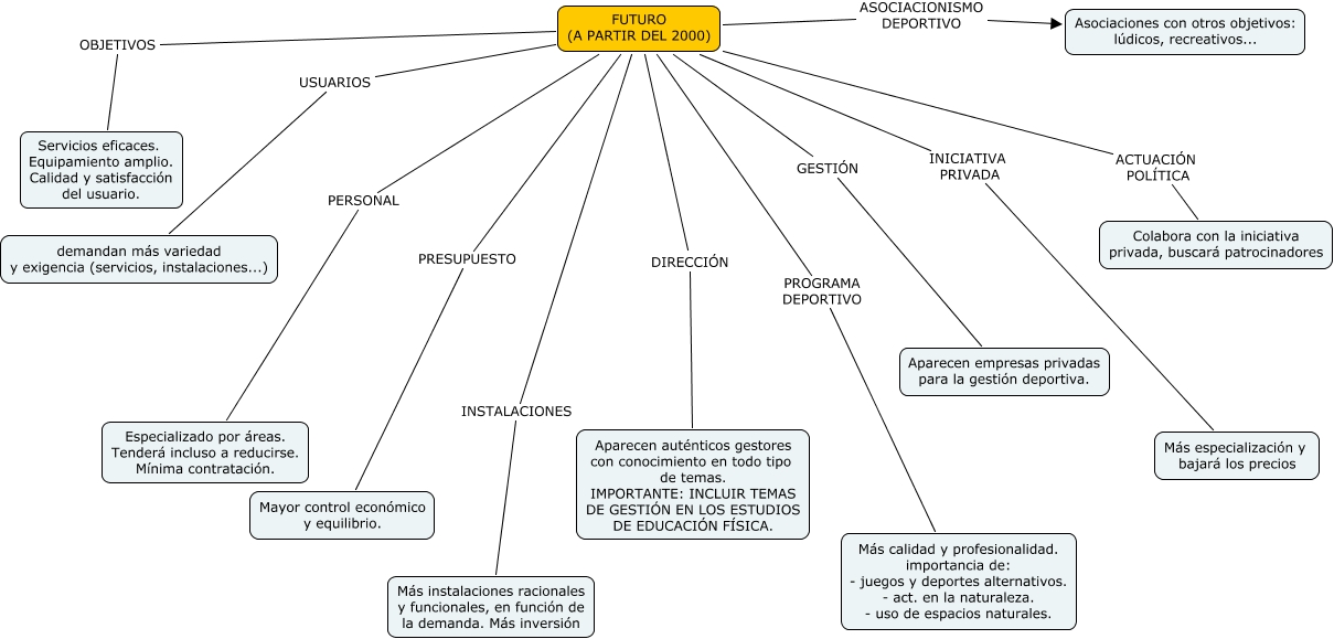 Este Cmap, tiene información relacionada con: FUTURO, FUTURO (A PARTIR DEL 2000) ACTUACIÓN POLÍTICA Colabora con la iniciativa privada, buscará patrocinadores, FUTURO (A PARTIR DEL 2000) PRESUPUESTO Mayor control económico y equilibrio., FUTURO (A PARTIR DEL 2000) ASOCIACIONISMO DEPORTIVO Asociaciones con otros objetivos: lúdicos, recreativos..., FUTURO (A PARTIR DEL 2000) DIRECCIÓN Aparecen auténticos gestores con conocimiento en todo tipo de temas. IMPORTANTE: INCLUIR TEMAS DE GESTIÓN EN LOS ESTUDIOS DE EDUCACIÓN FÍSICA., FUTURO (A PARTIR DEL 2000) GESTIÓN Aparecen empresas privadas para la gestión deportiva., FUTURO (A PARTIR DEL 2000) OBJETIVOS Servicios eficaces. Equipamiento amplio. Calidad y satisfacción del usuario., FUTURO (A PARTIR DEL 2000) INICIATIVA PRIVADA Más especialización y bajará los precios, FUTURO (A PARTIR DEL 2000) INSTALACIONES Más instalaciones racionales y funcionales, en función de la demanda. Más inversión, FUTURO (A PARTIR DEL 2000) PERSONAL Especializado por áreas. Tenderá incluso a reducirse. Mínima contratación., FUTURO (A PARTIR DEL 2000) USUARIOS demandan más variedad y exigencia (servicios, instalaciones...), FUTURO (A PARTIR DEL 2000) PROGRAMA DEPORTIVO Más calidad y profesionalidad. importancia de: - juegos y deportes alternativos. - act. en la naturaleza. - uso de espacios naturales.