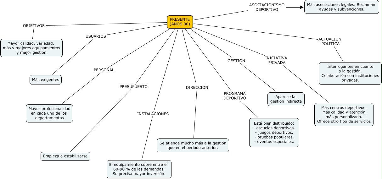 Este Cmap, tiene información relacionada con: PRESENTE, PRESENTE (AÑOS 90) DIRECCIÓN Se atiende mucho más a la gestión que en el periodo anterior., PRESENTE (AÑOS 90) OBJETIVOS Mayor calidad, variedad, más y mejores equipamientos y mejor gestión, PRESENTE (AÑOS 90) ASOCIACIONISMO DEPORTIVO Más asociaciones legales. Reclaman ayudas y subvenciones., PRESENTE (AÑOS 90) PRESUPUESTO Empieza a estabilizarse, PRESENTE (AÑOS 90) USUARIOS Más exigentes, PRESENTE (AÑOS 90) PERSONAL Mayor profesionalidad en cada uno de los departamentos, PRESENTE (AÑOS 90) GESTIÓN Aparece la gestión indirecta, PRESENTE (AÑOS 90) INICIATIVA PRIVADA Más centros deportivos. Más calidad y atención más personalizada. Ofrece otro tipo de servicios, PRESENTE (AÑOS 90) INSTALACIONES El equipamiento cubre entre el 60-90 % de las demandas. Se precisa mayor inversión., PRESENTE (AÑOS 90) ACTUACIÓN POLÍTICA Interrogantes en cuanto a la gestión. Colaboración con instituciones privadas., PRESENTE (AÑOS 90) PROGRAMA DEPORTIVO Está bien distribuido: - escuelas deportivas. - juegos deportivos. - pruebas populares. - eventos especiales.