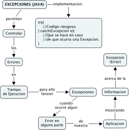 Este Cmap, tiene información relacionada con: Excepciones (JAVA), Errores en Tiempo de Ejecucion, Error en alguna parte de nuestra Aplicacion, Controlar los Errores, EXCEPCIONES (JAVA) implementacion: try{ //Codigo riesgoso. } catch(Excepcion e){ //Que se hace en caso //de que ocurra una Excepcion. }, Excepciones cuando ocurre algun Error en alguna parte, Informacion acerca de la Excepcion (Error), Aplicacion mostrando Informacion, EXCEPCIONES (JAVA) permiten Controlar, Tiempo de Ejecucion para ello lanzan Excepciones