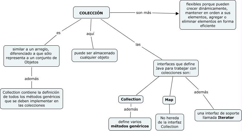 Este Cmap, tiene información relacionada con: Colecciones, Map ???? No hereda de la interfaz Collection, interfaces que define Java para trabajar con colecciones son: ???? Map, interfaces que define Java para trabajar con colecciones son: además una interfaz de soporte llamada Iterator, Collection además define varios métodos genéricos, COLECCIÓN las interfaces que define Java para trabajar con colecciones son:, similar a un arreglo, diferenciado a que sólo representa a un conjunto de Objetos además Collection contiene la definición de todos los métodos genéricos que se deben implementar en las colecciones, interfaces que define Java para trabajar con colecciones son: ???? Collection, COLECCIÓN aquí puede ser almacenado cualquier objeto, COLECCIÓN son más flexibles porque pueden crecer dinámicamente, mantener en orden a sus elementos, agregar o eliminar elementos en forma eficiente, COLECCIÓN es similar a un arreglo, diferenciado a que sólo representa a un conjunto de Objetos