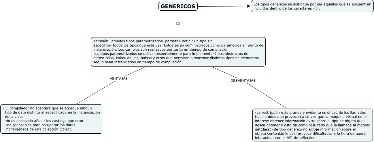 Este Cmap, tiene información relacionada con: GENERICOS, GENERICOS ???? Los tipos genéricos se distingue por ser aquellos que se encuentran incluidos dentro de los caracteres <>., También llamados tipos parametrizados, permiten definir un tipo sin especificar todos los tipos que éste usa. Estos serán suministrados como parámetros en punto de instanciación. Los cambios son realizados por tanto en tiempo de compilación. Los tipos parametrizados se utilizan especialmente para implementar tipos abstractos de datos: pilas, colas, anillos, bolsas y otros que permiten almacenar distintos tipos de elementos según sean instanciados en tiempo de compilación. VENTAJAS - El compilador no aceptará que se agregue ningún tipo de dato distinto al especificado en la instanciación de la clase. - No es necesario añadir los castings que eran indispensables para recuperar los datos homogéneos de una colección Object., También llamados tipos parametrizados, permiten definir un tipo sin especificar todos los tipos que éste usa. Estos serán suministrados como parámetros en punto de instanciación. Los cambios son realizados por tanto en tiempo de compilación. Los tipos parametrizados se utilizan especialmente para implementar tipos abstractos de datos: pilas, colas, anillos, bolsas y otros que permiten almacenar distintos tipos de elementos según sean instanciados en tiempo de compilación. DESVENTAJAS -La restricción más grande y evidente es el uso de los llamados tipos crudos que provocan a su vez que la máquina virtual no le interese obtener información extra sobre el tipo de objeto que desea obtener y esto da como resultado que la llamada al método getClass() de tipo genérico no arroje información sobre el objeto contenido lo cual provoca dificultades a la hora de querer interactuar con el API de reflection., GENERICOS ES También llamados tipos parametrizados, permiten definir un tipo sin especificar todos los tipos que éste usa. Estos serán suministrados como parámetros en punto de instanciación. Los cambios son realizados por tanto en tiempo de compilación. Los tipos parametrizados se utilizan especialmente para implementar tipos abstractos de datos: pilas, colas, anillos, bolsas y otros que permiten almacenar distintos tipos de elementos según sean instanciados en tiempo de compilación.