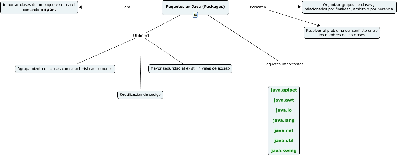 Este Cmap, tiene información relacionada con: paquetes, Paquetes en Java (Packages) Permiten Organizar grupos de clases , relacionados por finalidad, ambito o por herencia., Paquetes en Java (Packages) Utilidad Reutilizacion de codigo, Paquetes en Java (Packages) Utilidad Agrupamiento de clases con caracteristicas comunes, Paquetes en Java (Packages) Paquetes importantes java.aplpet java.awt java.io java.lang java.net java.util java.swing, Paquetes en Java (Packages) Para Importar clases de un paquete se usa el comando import, Paquetes en Java (Packages) Utilidad Mayor seguridad al existir niveles de acceso, Paquetes en Java (Packages) Permiten Resolver el problema del conflicto entre los nombres de las clases