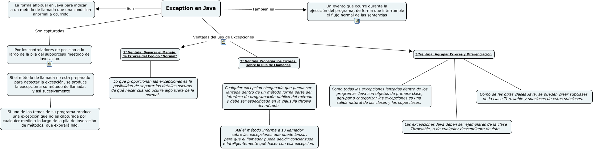 Este Cmap, tiene información relacionada con: Exceptiones, Exception en Java Ventajas del uso de Excepciones 1° Ventaja: Separar el Manejo de Errores del Código "Normal", 3°Ventaja: Agrupar Errores y Diferenciación ???? Como de las otras clases Java, se pueden crear subclases de la clase Throwable y subclases de estas subclases., 3°Ventaja: Agrupar Errores y Diferenciación ???? Las excepciones Java deben ser ejemplares de la clase Throwable, o de cualquier descendiente de ésta., Cualquier excepción chequeada que pueda ser lanzada dentro de un método forma parte del interface de programación público del método y debe ser especificado en la clausula throws del método. ???? Así el método informa a su llamador sobre las excepciones que puede lanzar, para que el llamador pueda decidir concienzuda e inteligentemente qué hacer con esa excepción., Exception en Java Ventajas del uso de Excepciones 3°Ventaja: Agrupar Errores y Diferenciación, 2° Ventaja:Propagar los Errores sobre la Pila de Llamadas ???? Cualquier excepción chequeada que pueda ser lanzada dentro de un método forma parte del interface de programación público del método y debe ser especificado en la clausula throws del método., Exception en Java Tambien es Un evento que ocurre durante la ejecución del programa, de forma que interrumple el flujo normal de las sentencias, Exception en Java Son La forma ahbitual en Java para indicar a un metodo de llamada que una condicion anormal a ocurrido., Exception en Java Ventajas del uso de Excepciones 2° Ventaja:Propagar los Errores sobre la Pila de Llamadas, Por los controladores de posicion a lo largo de la pila del subporceso meetodo de invocacion. ???? Si el método de llamada no está preparado para detectar la excepción, se produce la excepción a su método de llamada, y así sucesivamente, 1° Ventaja: Separar el Manejo de Errores del Código "Normal" ???? Lo que proporcionan las excepciones es la posibilidad de separar los detalles oscuros de qué hacer cuando ocurre algo fuera de la normal., Si el método de llamada no está preparado para detectar la excepción, se produce la excepción a su método de llamada, y así sucesivamente ???? Si uno de los temas de su programa produce una excepción que no es capturada por cualquier medio a lo largo de la pila de invocación de métodos, que expirará hilo., Exception en Java Son capturadas Por los controladores de posicion a lo largo de la pila del subporceso meetodo de invocacion., 3°Ventaja: Agrupar Errores y Diferenciación ???? Como todas las excepciones lanzadas dentro de los programas Java son objetos de primera clase, agrupar o categorizar las excepciones es una salida natural de las clases y las superclases.