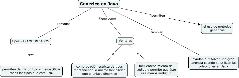 Este Cmap, tiene información relacionada con: Generico, Ventajas el fácil entendimiento del código y permite que éste sea menos ambiguo, Ventajas la comprobación estricta de tipos manteniendo la misma flexibilidad que el enlace dinámico, Generico en Java tiene como Ventajas, tipos PARAMETRIZADOS que permiten definir un tipo sin especificar todos los tipos que esté usa., Generico en Java permiten el uso de métodos genéricos, Generico en Java llamados tipos PARAMETRIZADOS, Generico en Java también ayudan a resolver una gran carencia cuando se utilizan las colecciones en Java