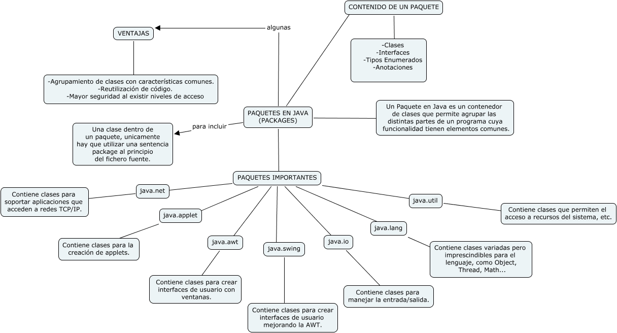 Este Cmap, tiene información relacionada con: paquetes, java.awt ???? Contiene clases para crear interfaces de usuario con ventanas., java.net ???? Contiene clases para soportar aplicaciones que acceden a redes TCP/IP., PAQUETES IMPORTANTES ???? java.applet, VENTAJAS ???? -Agrupamiento de clases con características comunes. -Reutilización de código. -Mayor seguridad al existir niveles de acceso, CONTENIDO DE UN PAQUETE ???? -Clases -Interfaces -Tipos Enumerados -Anotaciones, PAQUETES IMPORTANTES ???? java.awt, java.io ???? Contiene clases para manejar la entrada/salida., PAQUETES IMPORTANTES ???? java.swing, PAQUETES IMPORTANTES ???? java.util, PAQUETES IMPORTANTES ???? java.io, PAQUETES IMPORTANTES ???? java.net, java.util ???? Contiene clases que permiten el acceso a recursos del sistema, etc., PAQUETES EN JAVA (PACKAGES) algunas VENTAJAS, PAQUETES EN JAVA (PACKAGES) para incluir Una clase dentro de un paquete, unicamente hay que utilizar una sentencia package al principio del fichero fuente., PAQUETES EN JAVA (PACKAGES) ???? CONTENIDO DE UN PAQUETE, java.lang ???? Contiene clases variadas pero imprescindibles para el lenguaje, como Object, Thread, Math..., PAQUETES IMPORTANTES ???? java.lang, java.swing ???? Contiene clases para crear interfaces de usuario mejorando la AWT., java.applet ???? Contiene clases para la creación de applets., PAQUETES EN JAVA (PACKAGES) ???? Un Paquete en Java es un contenedor de clases que permite agrupar las distintas partes de un programa cuya funcionalidad tienen elementos comunes.