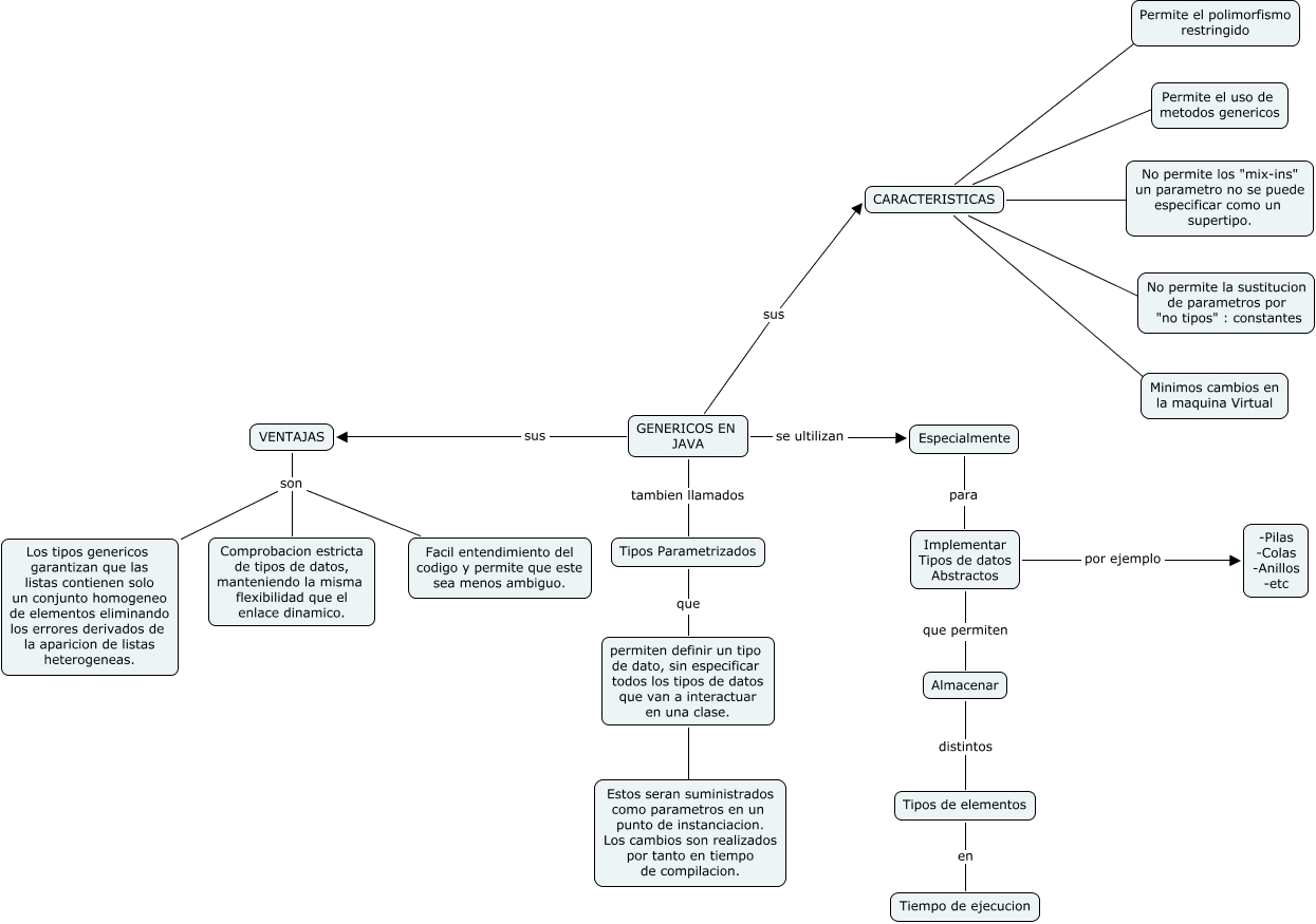 Este Cmap, tiene información relacionada con: genericos, GENERICOS EN JAVA sus CARACTERISTICAS, Tipos de elementos en Tiempo de ejecucion, permiten definir un tipo de dato, sin especificar todos los tipos de datos que van a interactuar en una clase. ???? Estos seran suministrados como parametros en un punto de instanciacion. Los cambios son realizados por tanto en tiempo de compilacion., VENTAJAS son Los tipos genericos garantizan que las listas contienen solo un conjunto homogeneo de elementos eliminando los errores derivados de la aparicion de listas heterogeneas., CARACTERISTICAS ???? No permite los "mix-ins" un parametro no se puede especificar como un supertipo., Implementar Tipos de datos Abstractos que permiten Almacenar, CARACTERISTICAS ???? Permite el uso de metodos genericos, CARACTERISTICAS ???? Minimos cambios en la maquina Virtual, CARACTERISTICAS ???? Permite el polimorfismo restringido, GENERICOS EN JAVA tambien llamados Tipos Parametrizados, Almacenar distintos Tipos de elementos, GENERICOS EN JAVA sus VENTAJAS, VENTAJAS son Comprobacion estricta de tipos de datos, manteniendo la misma flexibilidad que el enlace dinamico., VENTAJAS son Facil entendimiento del codigo y permite que este sea menos ambiguo., GENERICOS EN JAVA se ultilizan Especialmente, Implementar Tipos de datos Abstractos por ejemplo -Pilas -Colas -Anillos -etc, Tipos Parametrizados que permiten definir un tipo de dato, sin especificar todos los tipos de datos que van a interactuar en una clase., Especialmente para Implementar Tipos de datos Abstractos, CARACTERISTICAS ???? No permite la sustitucion de parametros por "no tipos" : constantes