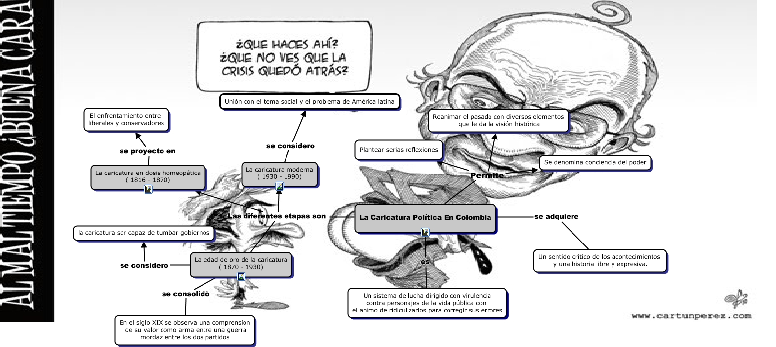 Este Cmap, tiene información relacionada con: Diana Paola Alarcon 2107875, La caricatura en dosis homeopática ( 1816 - 1870) se proyecto en El enfrentamiento entre liberales y conservadores, La Caricatura Política En Colombia Permite Reanimar el pasado con diversos elementos que le da la visión histórica, La Caricatura Política En Colombia Las diferentes etapas son La caricatura moderna ( 1930 - 1990), La Caricatura Política En Colombia Las diferentes etapas son La edad de oro de la caricatura ( 1870 - 1930), La caricatura moderna ( 1930 - 1990) se considero Unión con el tema social y el problema de América latina, La Caricatura Política En Colombia es Un sistema de lucha dirigido con virulencia contra personajes de la vida pública con el animo de ridiculizarlos para corregir sus errores, La Caricatura Política En Colombia Las diferentes etapas son La caricatura en dosis homeopática ( 1816 - 1870), La caricatura moderna ( 1930 - 1990) se considero Unión con el tema social y el problema de América latina, La Caricatura Política En Colombia Permite Se denomina conciencia del poder, La edad de oro de la caricatura ( 1870 - 1930) se considero la caricatura ser capaz de tumbar gobiernos, La edad de oro de la caricatura ( 1870 - 1930) se consolidó En el siglo XIX se observa una comprensión de su valor como arma entre una guerra mordaz entre los dos partidos, La Caricatura Política En Colombia Permite Plantear serias reflexiones, La Caricatura Política En Colombia se adquiere Un sentido critico de los acontecimientos y una historia libre y expresiva.
