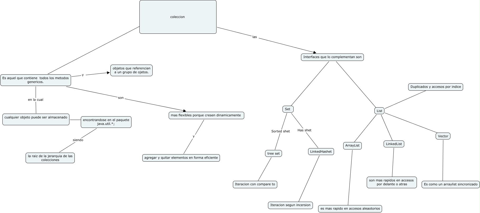 Este Cmap, tiene información relacionada con: Colecciones, List ???? ArrayList, Es aquel que contiene todos los metodos genericos. y objetos que referencian a un grupo de ojetos., Interfaces que lo complementan son ???? List, encontrandose en el paquete java.util.*; siendo la raiz de la jerarquia de las colecciones, mas flexibles porque cresen dinamicamente y agregar y quitar elementos en forma eficiente, Es aquel que contiene todos los metodos genericos. son mas flexibles porque cresen dinamicamente, tree set ???? Iteracion con compare to, LinkedList ???? son mas rapidos en accesos por delante o atras, List ???? Duplicados y accesos por indice, coleccion ???? Es aquel que contiene todos los metodos genericos., List ???? Vector, Set Sorted shet tree set, ArrayList ???? es mas rapido en accesos aleaotorios, cualquier objeto puede ser almacenado y encontrandose en el paquete java.util.*;, coleccion las Interfaces que lo complementan son, List ???? LinkedList, Interfaces que lo complementan son ???? Set, LinkedHashet ???? Iteracion segun incersion, Es aquel que contiene todos los metodos genericos. en la cual cualquier objeto puede ser almacenado, Vector ???? Es como un arraylist sincronizado