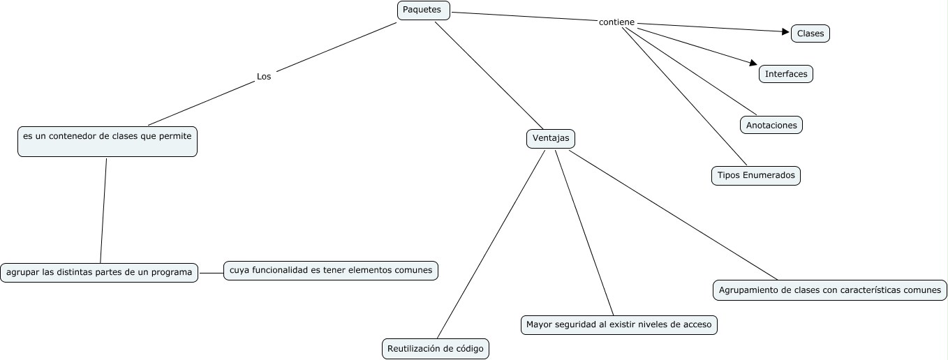 Este Cmap, tiene información relacionada con: Paquetes, Ventajas ???? Reutilización de código, agrupar las distintas partes de un programa ???? cuya funcionalidad es tener elementos comunes, Paquetes Los es un contenedor de clases que permite, es un contenedor de clases que permite ???? agrupar las distintas partes de un programa, Paquetes contiene Interfaces, Ventajas ???? Mayor seguridad al existir niveles de acceso, Paquetes contiene Tipos Enumerados, Paquetes contiene Clases, Paquetes ???? Ventajas, Paquetes contiene Anotaciones, Ventajas ???? Agrupamiento de clases con características comunes