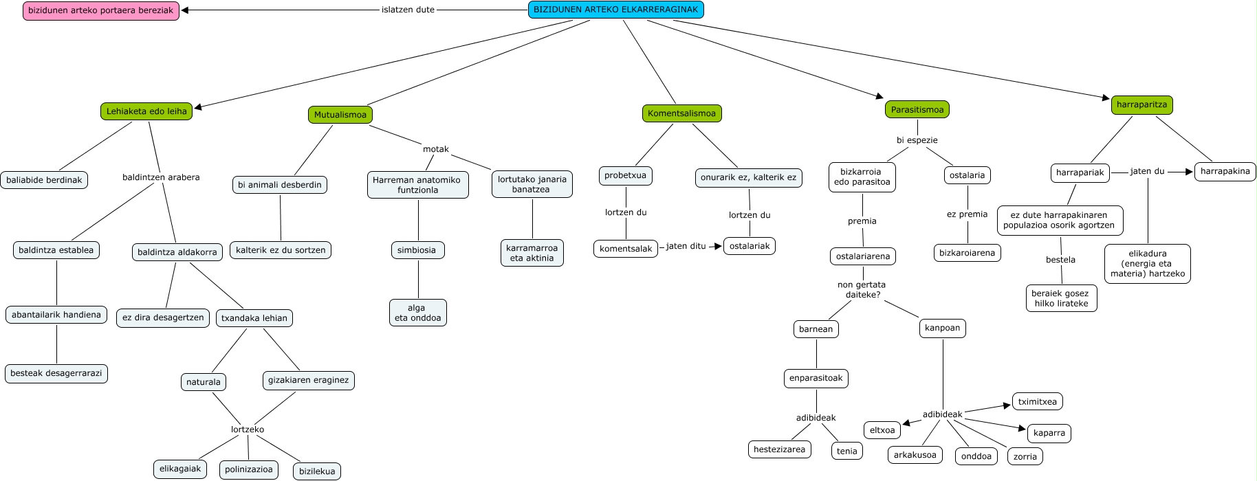 IHMC CmapTools-ekin sortu den kontzeptu-mapa honek honi buruzko informazioa du: elkarreraginak, BIZIDUNEN ARTEKO ELKARRERAGINAK Parasitismoa, probetxua lortzen du komentsalak, BIZIDUNEN ARTEKO ELKARRERAGINAK Mutualismoa, Mutualismoa bi animali desberdin, abantailarik handiena besteak desagerrarazi, kanpoan adibideak zorria, Lehiaketa edo leiha baldintzen arabera baldintza aldakorra, kanpoan adibideak tximitxea, gizakiaren eraginez lortzeko polinizazioa, Komentsalismoa probetxua, BIZIDUNEN ARTEKO ELKARRERAGINAK Lehiaketa edo leiha, Parasitismoa bi espezie bizkarroia edo parasitoa, naturala lortzeko polinizazioa, ostalariarena non gertata daiteke? barnean, harrapariak ez dute harrapakinaren populazioa osorik agortzen, naturala lortzeko elikagaiak, harrapariak jaten du elikadura (energia eta materia) hartzeko, enparasitoak adibideak hestezizarea, kanpoan adibideak eltxoa, kanpoan adibideak kaparra