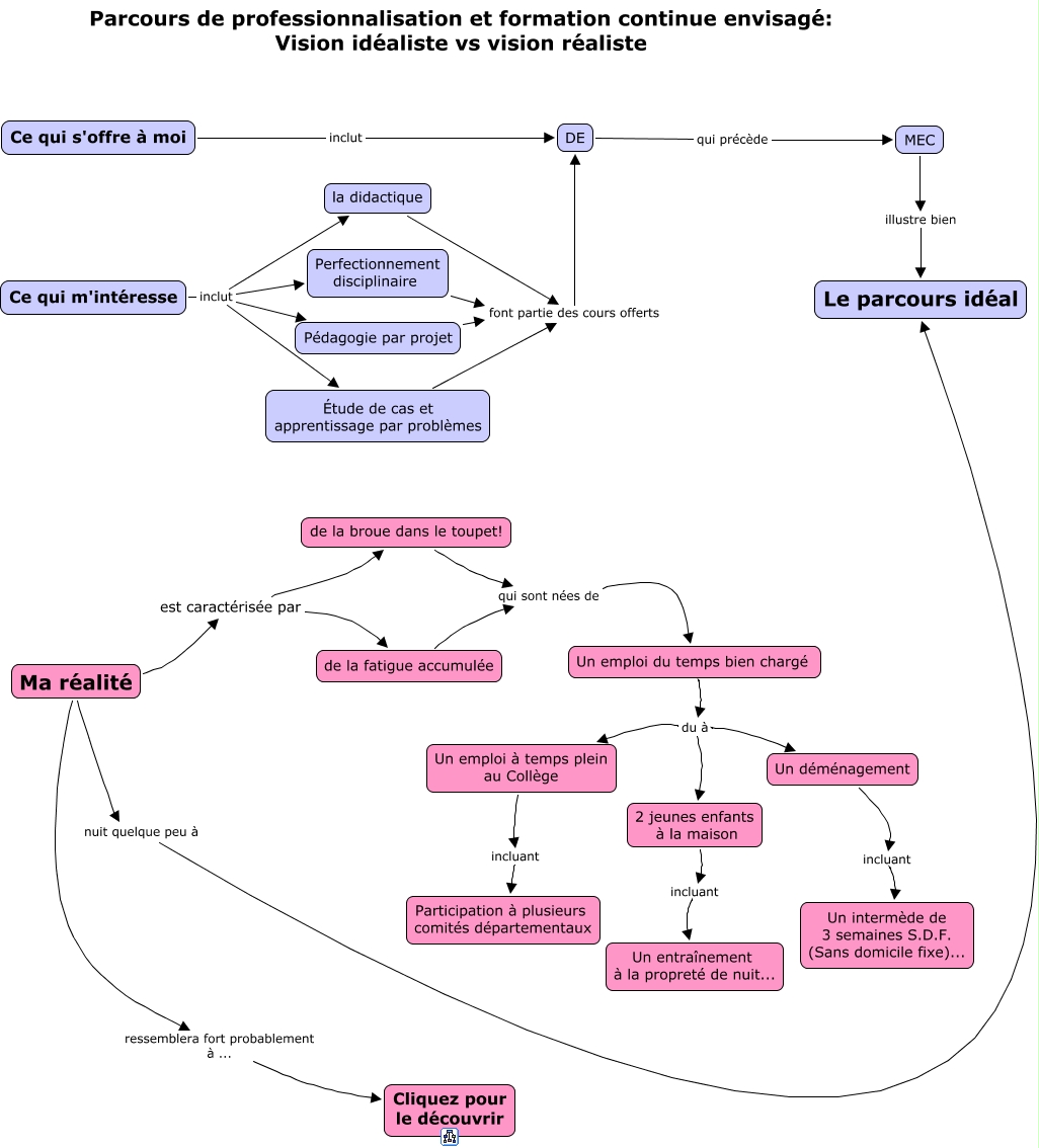 Cette carte de concepts créée avec IHMC CmapTools traite de: Vision idéaliste vs réaliste, Un déménagement incluant Un intermède de 3 semaines S.D.F. (Sans domicile fixe)..., Ce qui m'intéresse inclut Perfectionnement disciplinaire, MEC illustre bien Le parcours idéal, Un emploi du temps bien chargé du à Un déménagement, Un emploi du temps bien chargé du à Un emploi à temps plein au Collège, de la fatigue accumulée qui sont nées de Un emploi du temps bien chargé, Ce qui m'intéresse inclut Pédagogie par projet, Ma réalité nuit quelque peu à Le parcours idéal, Ce qui m'intéresse inclut la didactique, Ma réalité ressemblera fort probablement à ... Cliquez pour le découvrir, Ma réalité est caractérisée par de la broue dans le toupet!, 2 jeunes enfants à la maison incluant Un entraînement à la propreté de nuit..., Un emploi du temps bien chargé du à 2 jeunes enfants à la maison, Étude de cas et apprentissage par problèmes font partie des cours offerts DE, Ma réalité est caractérisée par de la fatigue accumulée, Ce qui m'intéresse inclut Étude de cas et apprentissage par problèmes, DE qui précède MEC, la didactique font partie des cours offerts DE, Un emploi à temps plein au Collège incluant Participation à plusieurs comités départementaux, de la broue dans le toupet! qui sont nées de Un emploi du temps bien chargé