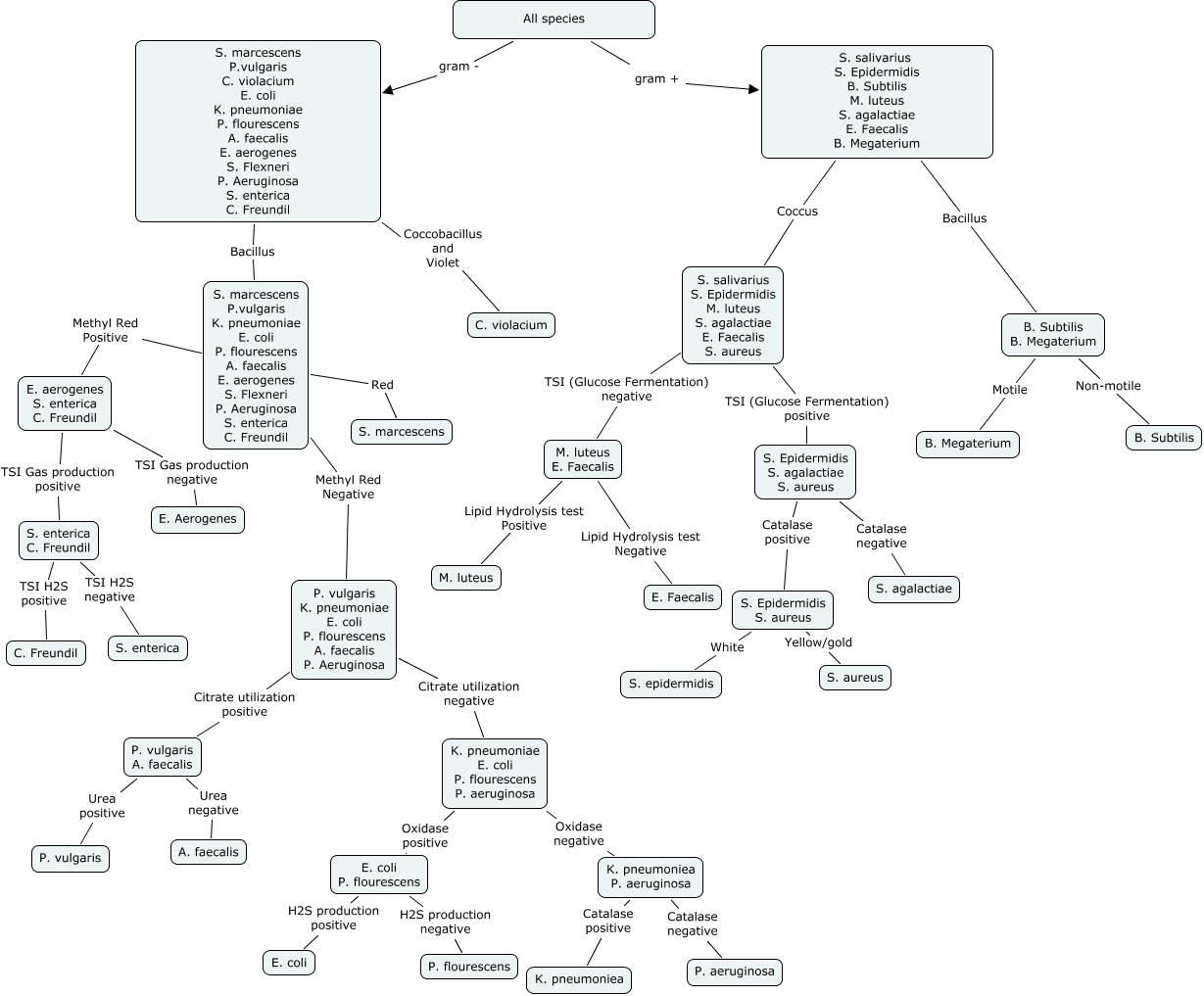 This Concept Map, created with IHMC CmapTools, has information related to: Pet organisms, S. marcescens P.vulgaris K. pneumoniae E. coli P. flourescens A. faecalis E. aerogenes S. Flexneri P. Aeruginosa S. enterica C. Freundil Red S. marcescens, P. vulgaris A. faecalis Urea negative A. faecalis, K. pneumoniea P. aeruginosa Catalase negative P. aeruginosa, B. Subtilis B. Megaterium Motile B. Megaterium, S. salivarius S. Epidermidis B. Subtilis M. luteus S. agalactiae E. Faecalis B. Megaterium Coccus S. salivarius S. Epidermidis M. luteus S. agalactiae E. Faecalis S. aureus, All species gram - S. marcescens P.vulgaris C. violacium E. coli K. pneumoniae P. flourescens A. faecalis E. aerogenes S. Flexneri P. Aeruginosa S. enterica C. Freundil, All species gram + S. salivarius S. Epidermidis B. Subtilis M. luteus S. agalactiae E. Faecalis B. Megaterium, M. luteus E. Faecalis Lipid Hydrolysis test Positive M. luteus, P. vulgaris K. pneumoniae E. coli P. flourescens A. faecalis P. Aeruginosa Citrate utilization positive P. vulgaris A. faecalis, S. Epidermidis S. aureus White S. epidermidis, S. enterica C. Freundil TSI H2S negative S. enterica, S. marcescens P.vulgaris K. pneumoniae E. coli P. flourescens A. faecalis E. aerogenes S. Flexneri P. Aeruginosa S. enterica C. Freundil Methyl Red Positive E. aerogenes S. enterica C. Freundil, S. salivarius S. Epidermidis M. luteus S. agalactiae E. Faecalis S. aureus TSI (Glucose Fermentation) negative M. luteus E. Faecalis, S. marcescens P.vulgaris C. violacium E. coli K. pneumoniae P. flourescens A. faecalis E. aerogenes S. Flexneri P. Aeruginosa S. enterica C. Freundil Bacillus S. marcescens P.vulgaris K. pneumoniae E. coli P. flourescens A. faecalis E. aerogenes S. Flexneri P. Aeruginosa S. enterica C. Freundil, E. coli P. flourescens H2S production positive E. coli, K. pneumoniae E. coli P. flourescens P. aeruginosa Oxidase positive E. coli P. flourescens, S. marcescens P.vulgaris K. pneumoniae E. coli P. flourescens A. faecalis E. aerogenes S. Flexneri P. Aeruginosa S. enterica C. Freundil Methyl Red Negative P. vulgaris K. pneumoniae E. coli P. flourescens A. faecalis P. Aeruginosa, S. Epidermidis S. agalactiae S. aureus Catalase positive S. Epidermidis S. aureus, S. enterica C. Freundil TSI H2S positive C. Freundil, K. pneumoniae E. coli P. flourescens P. aeruginosa Oxidase negative K. pneumoniea P. aeruginosa
