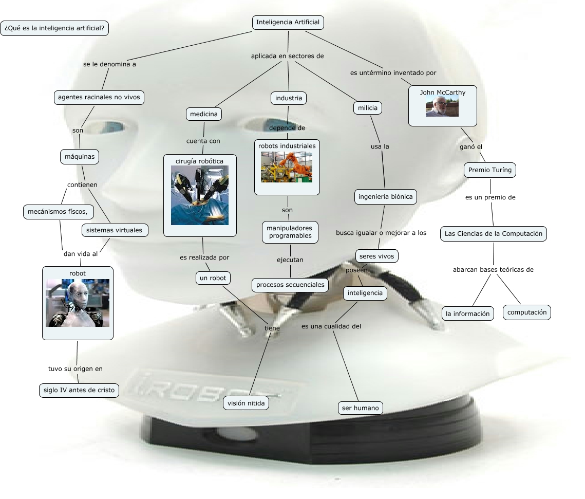 Este Cmap, tiene información relacionada con: Inteligencia Artificial, un robot tiene visión nitida, seres vivos poseen inteligencia, máquinas contienen sistemas virtuales, Inteligencia Artificial se le denomina a agentes racinales no vivos, Las Ciencias de la Computación abarcan bases teóricas de la información, robots industriales son manipuladores programables, sistemas virtuales dan vida al robot, Inteligencia Artificial aplicada en sectores de industria, medicina cuenta con cirugía robótica, Las Ciencias de la Computación abarcan bases teóricas de computación, John McCarthy ganó el Premio Turíng, mecánismos físcos, dan vida al robot, robot tuvo su origen en siglo IV antes de cristo, Inteligencia Artificial aplicada en sectores de milicia, milicia usa la ingeniería biónica, manipuladores programables ejecutan procesos secuenciales, máquinas contienen mecánismos físcos,, ingeniería biónica busca igualar o mejorar a los seres vivos, industria depende de robots industriales, Premio Turíng es un premio de Las Ciencias de la Computación