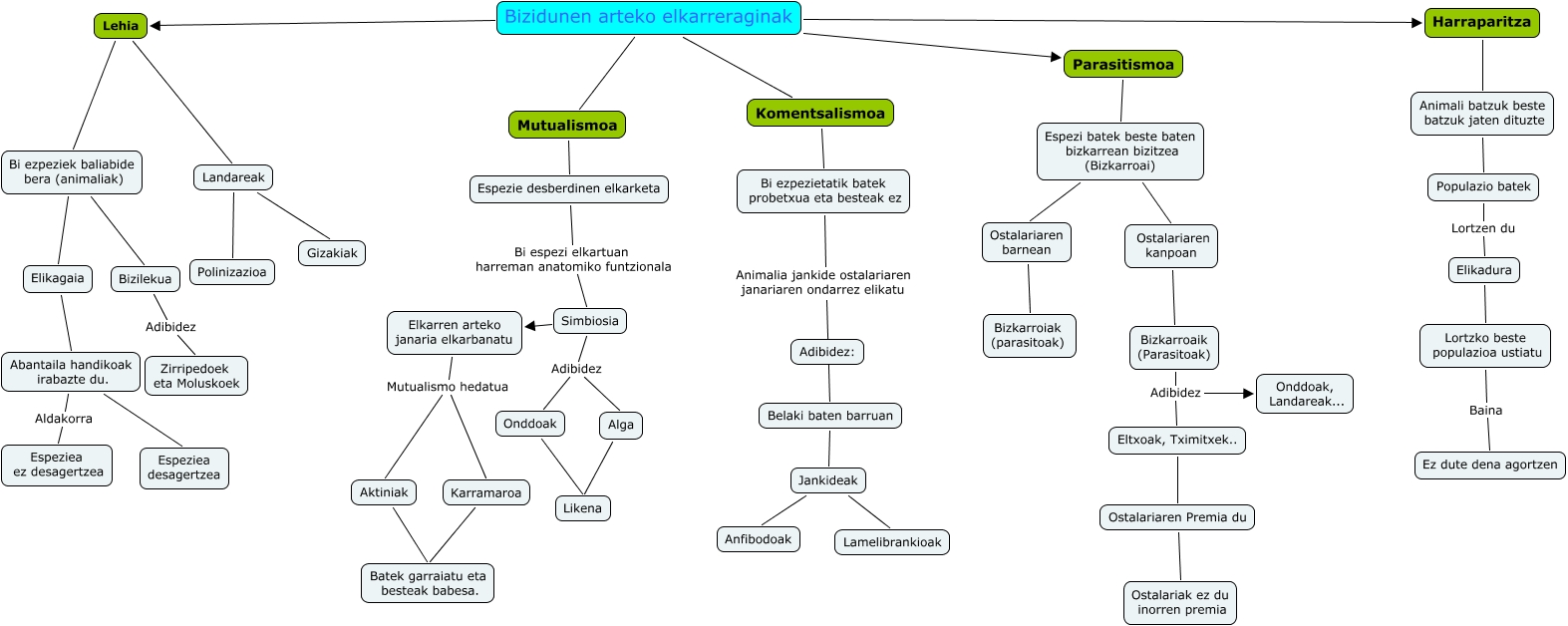 IHMC CmapTools-ekin sortu den kontzeptu-mapa honek honi buruzko informazioa du: Elkarreraginak, Bizidunen arteko elkarreraginak Harraparitza, Belaki baten barruan Jankideak, Jankideak Anfibodoak, Ostalariaren barnean Bizkarroiak (parasitoak), Elikagaia Abantaila handikoak irabazte du., Lortzko beste populazioa ustiatu Baina Ez dute dena agortzen, Bizidunen arteko elkarreraginak Lehia, Eltxoak, Tximitxek.. Ostalariaren Premia du, Bi ezpeziek baliabide bera (animaliak) Bizilekua, Simbiosia Adibidez Onddoak, Lehia Landareak, Bi ezpeziek baliabide bera (animaliak) Elikagaia, Simbiosia Elkarren arteko janaria elkarbanatu, Harraparitza Animali batzuk beste batzuk jaten dituzte, Bizilekua Adibidez Zirripedoek eta Moluskoek, Bizidunen arteko elkarreraginak Parasitismoa, Ostalariaren kanpoan Bizkarroaik (Parasitoak), Bizidunen arteko elkarreraginak Mutualismoa, Mutualismoa Espezie desberdinen elkarketa, Bi ezpezietatik batek probetxua eta besteak ez Animalia jankide ostalariaren janariaren ondarrez elikatu Belaki baten barruan