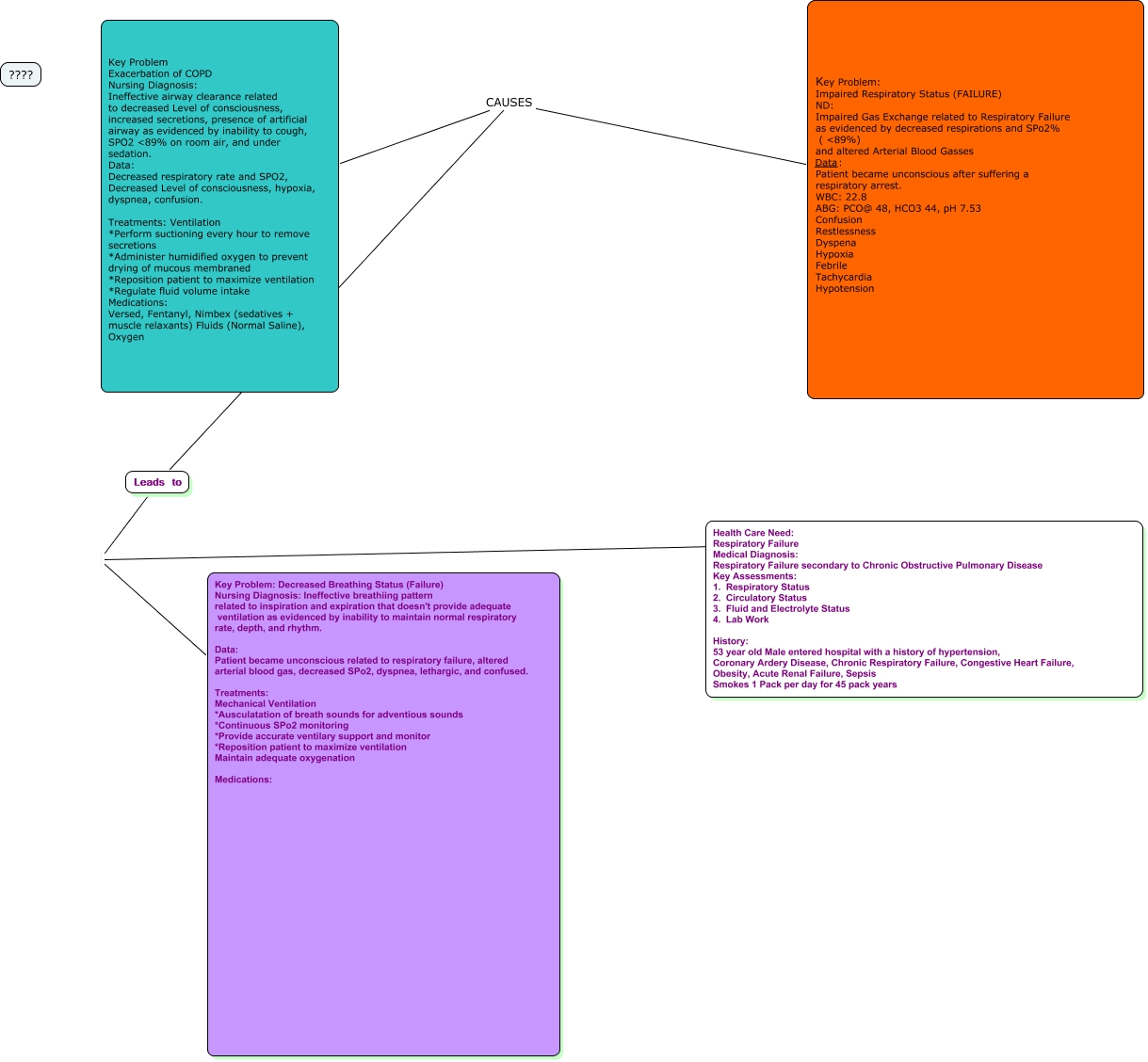 This Concept Map, created with IHMC CmapTools, has information related to: Zwerner in progress, Key Problem: Impaired Respiratory Status (FAILURE) ND: Impaired Gas Exchange related to Respiratory Failure as evidenced by decreased respirations and SPo2% ( ៉%) and altered Arterial Blood Gasses Data: Patient became unconscious after suffering a respiratory arrest. WBC: 22.8 ABG: PCO@ 48, HCO3 44, pH 7.53 Confusion Restlessness Dyspena Hypoxia Febrile Tachycardia Hypotension CAUSES Leads to, Leads to ????, Leads to Key Problem: Decreased Breathing Status (Failure) Nursing Diagnosis: Ineffective breathiing pattern related to inspiration and expiration that doesn't provide adequate ventilation as evidenced by inability to maintain normal respiratory rate, depth, and rhythm. Data: Patient became unconscious related to respiratory failure, altered arterial blood gas, decreased SPo2, dyspnea, lethargic, and confused. Treatments: Mechanical Ventilation *Ausculatation of breath sounds for adventious sounds *Continuous SPo2 monitoring *Provide accurate ventilary support and monitor *Reposition patient to maximize ventilation Maintain adequate oxygenation Medications:, Key Problem: Impaired Respiratory Status (FAILURE) ND: Impaired Gas Exchange related to Respiratory Failure as evidenced by decreased respirations and SPo2% ( ៉%) and altered Arterial Blood Gasses Data: Patient became unconscious after suffering a respiratory arrest. WBC: 22.8 ABG: PCO@ 48, HCO3 44, pH 7.53 Confusion Restlessness Dyspena Hypoxia Febrile Tachycardia Hypotension CAUSES Key Problem Exacerbation of COPD Nursing Diagnosis: Ineffective airway clearance related to decreased Level of consciousness, increased secretions, presence of artificial airway as evidenced by inability to cough, SPO2 ៉% on room air, and under sedation. Data: Decreased respiratory rate and SPO2, Decreased Level of consciousness, hypoxia, dyspnea, confusion. Treatments: Ventilation *Perform suctioning every hour to remove secretions *Administer humidified oxygen to prevent drying of mucous membraned *Reposition patient to maximize ventilation *Regulate fluid volume intake Medications: Versed, Fentanyl, Nimbex (sedatives + muscle relaxants) Fluids (Normal Saline), Oxygen