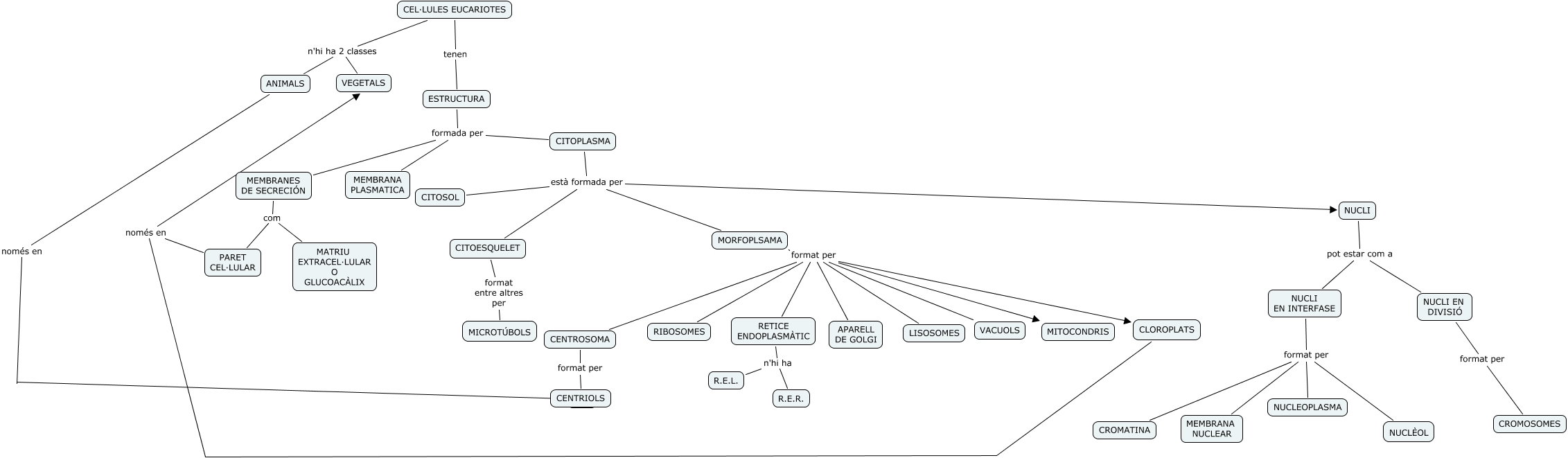 Este Cmap, tiene información relacionada con: EUCARIOTAS MAS, NUCLI EN INTERFASE format per NUCLEOPLASMA, MORFOPLSAMA format per RIBOSOMES, CLOROPLATS només en VEGETALS, CITOPLASMA està formada per NUCLI, ESTRUCTURA formada per MEMBRANES DE SECRECIÓN, NUCLI EN INTERFASE format per MEMBRANA NUCLEAR, NUCLI EN INTERFASE format per NUCLÈOL, MORFOPLSAMA format per VACUOLS, NUCLI EN INTERFASE format per CROMATINA, CITOESQUELET format entre altres per MICROTÚBOLS, NUCLI pot estar com a NUCLI EN DIVISIÓ, ESTRUCTURA formada per MEMBRANA PLASMATICA, MORFOPLSAMA format per RETICE ENDOPLASMÀTIC, MEMBRANES DE SECRECIÓN com PARET CEL·LULAR, NUCLI EN DIVISIÓ format per CROMOSOMES, CEL·LULES EUCARIOTES n'hi ha 2 classes ANIMALS, RETICE ENDOPLASMÀTIC n'hi ha R.E.L., CITOPLASMA està formada per CITOESQUELET, CEL·LULES EUCARIOTES tenen ESTRUCTURA, ???? només en ANIMALS