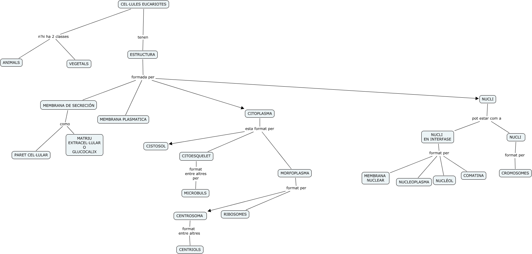 Este Cmap, tiene información relacionada con: EUCARIOTES VALVERDE, NUCLI format per CROMOSOMES, NUCLI EN INTERFASE format per NUCLÈOL, CENTROSOMA format entre altres CENTRIOLS, CITOPLASMA esta format per CISTOSOL, CITOPLASMA esta format per MORFOPLASMA, NUCLI EN INTERFASE format per MEMBRANA NUCLEAR, MORFOPLASMA format per CENTROSOMA, ESTRUCTURA formada per MEMBRANA PLASMATICA, NUCLI pot estar com a NUCLI EN INTERFASE, CEL·LULES EUCARIOTES tenen ESTRUCTURA, ESTRUCTURA formada per MEMBRANA DE SECRECIÓN, MEMBRANA DE SECRECIÓN como PARET CEL·LULAR, CEL·LULES EUCARIOTES n'hi ha 2 classes VEGETALS, MEMBRANA DE SECRECIÓN como MATRIU EXTRACEL·LULAR O GLUCOCALIX, CEL·LULES EUCARIOTES n'hi ha 2 classes ANIMALS, ESTRUCTURA formada per NUCLI, MORFOPLASMA format per RIBOSOMES, CITOESQUELET format entre altres per MICROBULS, NUCLI EN INTERFASE format per COMATINA, NUCLI EN INTERFASE format per NUCLEOPLASMA