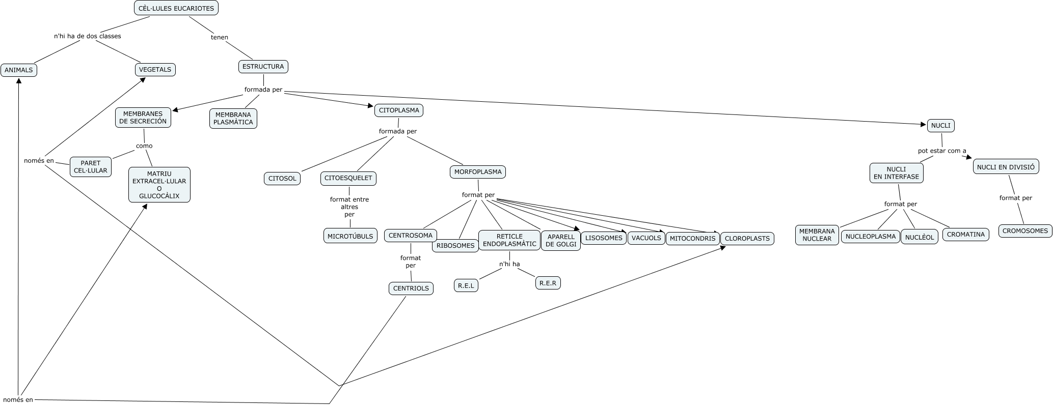 Este Cmap, tiene información relacionada con: EucariotesSansa, CITOESQUELET format entre altres per MICROTÚBULS, MORFOPLASMA format per MITOCONDRIS, CITOPLASMA formada per CITOSOL, MORFOPLASMA format per APARELL DE GOLGI, MEMBRANES DE SECRECIÓN como PARET CEL·LULAR, NUCLI EN INTERFASE format per MEMBRANA NUCLEAR, CÈL·LULES EUCARIOTES n'hi ha de dos classes ANIMALS, MORFOPLASMA format per VACUOLS, NUCLI pot estar com a NUCLI EN INTERFASE, CITOPLASMA formada per MORFOPLASMA, PARET CEL·LULAR només en CLOROPLASTS, ESTRUCTURA formada per CITOPLASMA, NUCLI EN INTERFASE format per NUCLÈOL, RETICLE ENDOPLASMÀTIC n'hi ha R.E.L, MORFOPLASMA format per CLOROPLASTS, MORFOPLASMA format per RETICLE ENDOPLASMÀTIC, MORFOPLASMA format per CENTROSOMA, MEMBRANES DE SECRECIÓN como MATRIU EXTRACEL·LULAR O GLUCOCÀLIX, CENTRIOLS només en ANIMALS, ESTRUCTURA formada per NUCLI