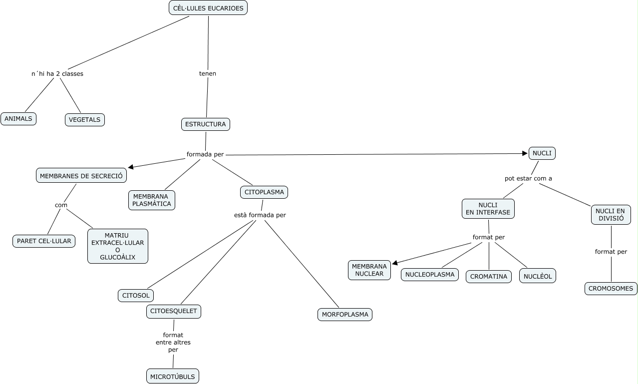 Este Cmap, tiene información relacionada con: EUCARIOTES RIBA, CÈL·LULES EUCARIOES n´hi ha 2 classes VEGETALS, NUCLI EN INTERFASE format per NUCLÈOL, NUCLI EN INTERFASE format per NUCLEOPLASMA, ESTRUCTURA formada per CITOPLASMA, CITOPLASMA està formada per CITOSOL, NUCLI EN DIVISIÓ format per CROMOSOMES, NUCLI pot estar com a NUCLI EN DIVISIÓ, MEMBRANES DE SECRECIÓ com PARET CEL·LULAR, NUCLI pot estar com a NUCLI EN INTERFASE, ESTRUCTURA formada per MEMBRANES DE SECRECIÓ, CÈL·LULES EUCARIOES tenen ESTRUCTURA, MEMBRANES DE SECRECIÓ com MATRIU EXTRACEL·LULAR O GLUCOÀLIX, CITOPLASMA està formada per MORFOPLASMA, NUCLI EN INTERFASE format per MEMBRANA NUCLEAR, ESTRUCTURA formada per MEMBRANA PLASMÀTICA, NUCLI EN INTERFASE format per CROMATINA, ESTRUCTURA formada per NUCLI, CÈL·LULES EUCARIOES n´hi ha 2 classes ANIMALS, CITOPLASMA està formada per CITOESQUELET, CITOESQUELET format entre altres per MICROTÚBULS