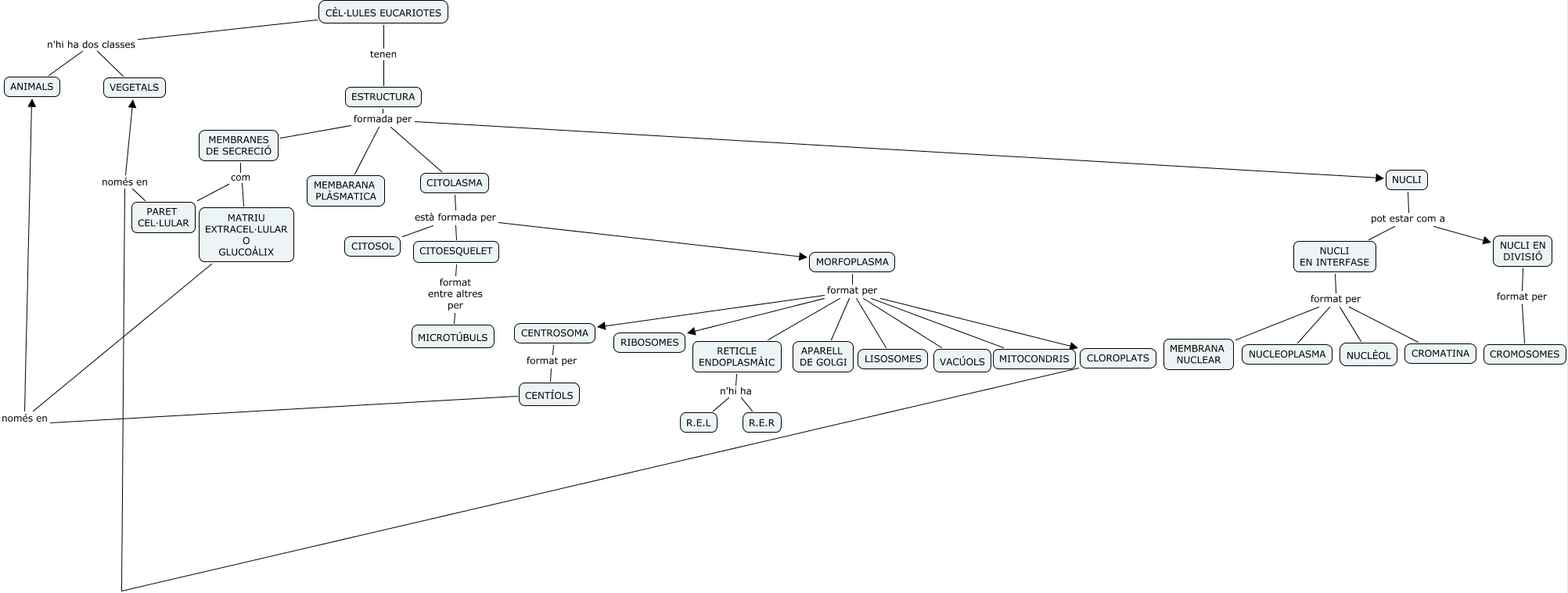 Este Cmap, tiene información relacionada con: EUCARIOTES MITJÀ, CITOLASMA està formada per CITOESQUELET, CLOROPLATS només en VEGETALS, RETICLE ENDOPLASMÀIC n'hi ha R.E.L, MEMBRANES DE SECRECIÓ com MATRIU EXTRACEL·LULAR O GLUCOÀLIX, MORFOPLASMA format per MITOCONDRIS, PARET CEL·LULAR només en VEGETALS, NUCLI pot estar com a NUCLI EN INTERFASE, NUCLI EN INTERFASE format per NUCLÈOL, MORFOPLASMA format per APARELL DE GOLGI, CÈL·LULES EUCARIOTES n'hi ha dos classes VEGETALS, MORFOPLASMA format per LISOSOMES, CENTÍOLS només en ANIMALS, ESTRUCTURA formada per NUCLI, CENTROSOMA format per CENTÍOLS, CITOLASMA està formada per MORFOPLASMA, MEMBRANES DE SECRECIÓ formada per MEMBARANA PLÀSMATICA, MORFOPLASMA format per RETICLE ENDOPLASMÀIC, MEMBRANES DE SECRECIÓ com PARET CEL·LULAR, RETICLE ENDOPLASMÀIC n'hi ha R.E.R, MEMBRANES DE SECRECIÓ formada per CITOLASMA