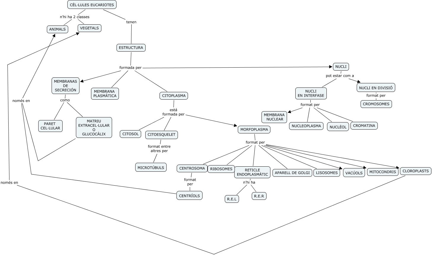 Este Cmap, tiene información relacionada con: eucatrtioata framis, MORFOPLASMA format per CLOROPLASTS, CITOPLASMA está formada per CITOESQUELET, RETICLE ENDOPLASMÀTIC n'hi ha R.E.L, ESTRUCTURA formada per CITOPLASMA, CITOPLASMA está formada per MORFOPLASMA, MORFOPLASMA format per RIBOSOMES, MATRIU EXTRACEL·LULAR O GLUCOCÀLIX només en ANIMALS, ESTRUCTURA formada per NUCLI, NUCLI EN INTERFASE format per NUCLEOPLASMA, CÈL·LULES EUCARIOTES tenen ESTRUCTURA, NUCLI EN INTERFASE format per NUCLÈOL, NUCLI pot estar com a NUCLI EN DIVISIÓ, ESTRUCTURA formada per MEMBRANAS DE SECRECIÓN, CITOESQUELET format entre altres per MICROTÚBULS, MORFOPLASMA format per CENTROSOMA, RETICLE ENDOPLASMÀTIC n'hi ha R.E.R, MORFOPLASMA format per MITOCONDRIS, MEMBRANAS DE SECRECIÓN como MATRIU EXTRACEL·LULAR O GLUCOCÀLIX, CÈL·LULES EUCARIOTES n'hi ha 2 classes VEGETALS, CLOROPLASTS només en VEGETALS