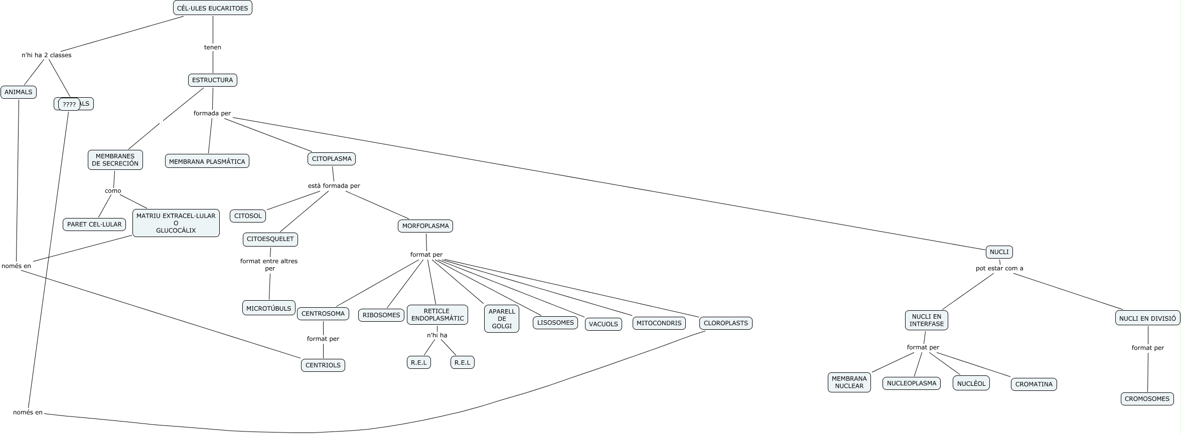 Este Cmap, tiene información relacionada con: EucariotaCalleCrespo, NUCLI EN INTERFASE format per CROMATINA, NUCLI EN INTERFASE format per MEMBRANA NUCLEAR, MEMBRANES DE SECRECIÓN como MATRIU EXTRACEL·LULAR O GLUCOCÀLIX, NUCLI pot estar com a NUCLI EN INTERFASE, CÈL·ULES EUCARITOES n'hi ha 2 classes VEGETALS, MORFOPLASMA format per CENTROSOMA, CITOPLASMA està formada per CITOSOL, RETICLE ENDOPLASMÀTIC n'hi ha R.E.L, CLOROPLASTS només en ????, MORFOPLASMA format per MITOCONDRIS, ESTRUCTURA formada per CITOPLASMA, ESTRUCTURA MEMBRANES DE SECRECIÓN, RETICLE ENDOPLASMÀTIC n'hi ha R.E.L, CITOPLASMA està formada per CITOESQUELET, NUCLI pot estar com a NUCLI EN DIVISIÓ, NUCLI EN INTERFASE format per NUCLEOPLASMA, MORFOPLASMA format per RETICLE ENDOPLASMÀTIC, MATRIU EXTRACEL·LULAR O GLUCOCÀLIX només en ANIMALS, MORFOPLASMA format per VACUOLS, ESTRUCTURA formada per NUCLI