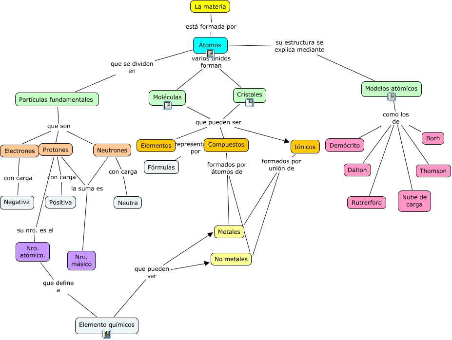 Este Cmap, tiene información relacionada con: eval, Moléculas que pueden ser Elementos, Elemento químicos que pueden ser No metales, Átomos que se dividen en Partículas fundamentales, Cristales que pueden ser Elementos, Cristales que pueden ser Compuestos, Protones con carga Positiva, Elemento químicos que pueden ser Metales, Neutrones con carga Neutra, Protones la suma es Nro. másico, Partículas fundamentales que son Electrones, Modelos atómicos como los de Dalton, Moléculas que pueden ser Compuestos, Átomos varios unidos forman Cristales, Átomos su estructura se explica mediante Modelos atómicos, Modelos atómicos como los de Rutrerford, Compuestos representados por Fórmulas, Partículas fundamentales que son Neutrones, La materia está formada por Átomos, Neutrones la suma es Nro. másico, Modelos atómicos como los de Thomson