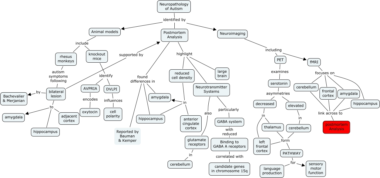 Autism Brain - JDN Rev, glutamate receptors in cerebellum, reduced cell density in amygdala, Reported by Bauman & Kemper found differences in hippocampus, frontal cortex link across to postmortem Analysis, PET examines serotonin, PATHWAY for sensory motor function, fMRI focuses on amygdala, cerebellum link across to postmortem Analysis, bilateral lesion to amygdala, reduced cell density in hippocampus