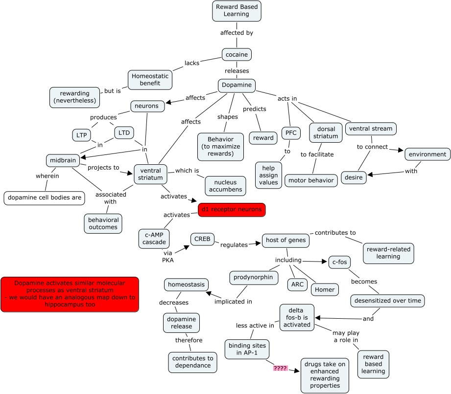 SH Reward Based Learning, prodynorphin implicated in homeostasis, CREB regulates host of genes, ventral striatum associated with behavioral outcomes, midbrain associated with behavioral outcomes, host of genes including c-fos, LTP in midbrain, environment with desire, dopamine release therefore contributes to dependance, dorsal striatum to facilitate motor behavior, LTD in midbrain