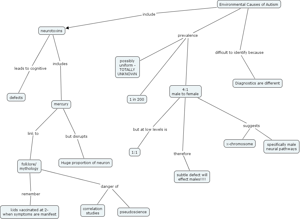 Autism Environmnetal causes, folklore/ mythology danger of correlation studies, 4:1 male to female but at low levels is 1:1, Environmental Causes of Autism prevalence possibly uniform - TOTALLY UNKNOWN, 4:1 male to female therefore subtle defect will effect males!!!!, Environmental Causes of Autism prevalence 1 in 200, folklore/ mythology danger of pseudoscience, neurotoxins leads to cognitive defects, 4:1 male to female suggests x-chromosome, Environmental Causes of Autism include neurotoxins, mercury link to folklore/ mythology